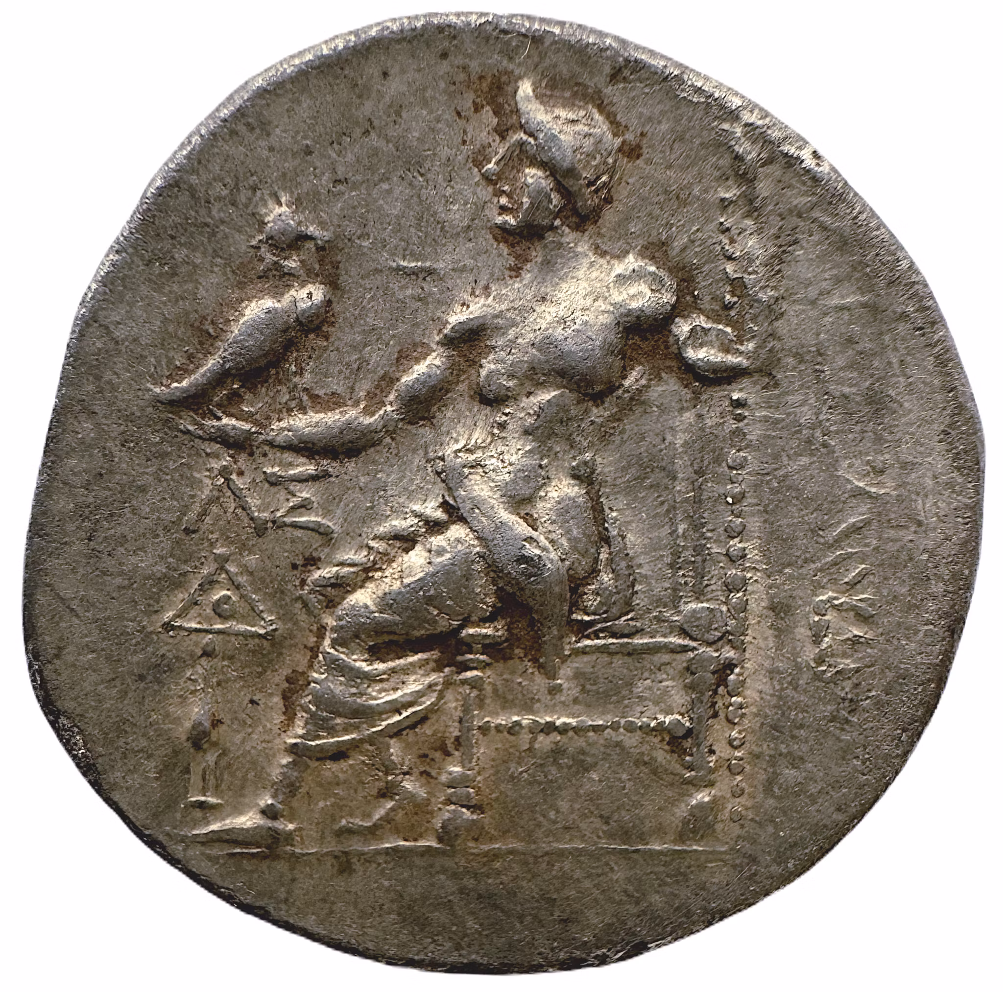Vacker tetradrachm i hög relief och med fin lyster. Åtsidan avbildar Herkules bärande lejonskinn (i gestalt av Alexander den Store). Frånsidan Zeus tronande med konungens namn på grekiska bakom "ALEXANDROS". Ett välcentrerat mynt i hög relief, med full detaljrikedom och nästan full bevarad präglingsglans. Frånsidan lätt dubbelpräglad och några mindre märken. Präglad på stor plants. Av senare typ. 16.72g, 28mm, kvalitet 1+/01++