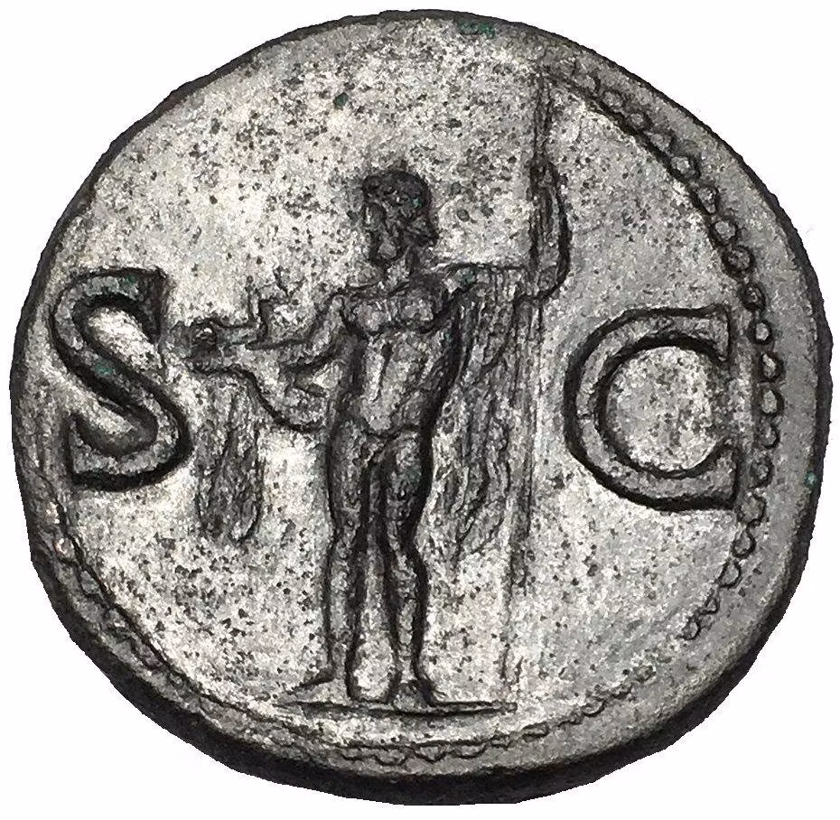 Ett fantastisk välbevarat exemplar av ett historiskt viktigt "typmynt". Åtsidan avbildar Agrippas kraftfulla porträtt och på frånsidan stående Neptunus med treudd. Perfekt centrerad på stort myntämne. Ett tillfälle för samlaren av historiska mynt. 1+/01