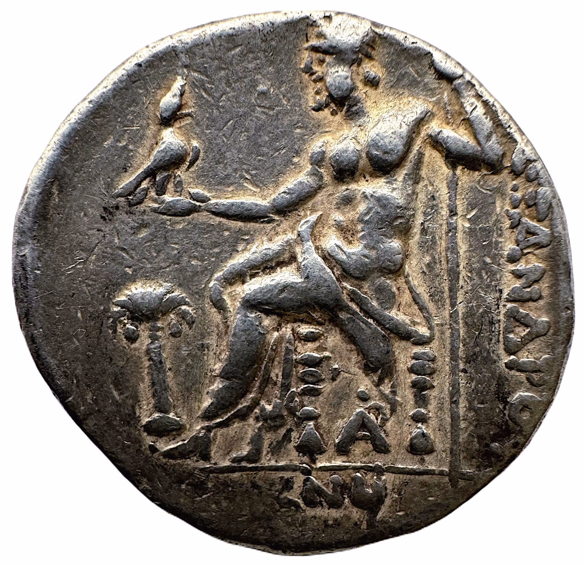 Tetradrachm av senare typ på stor plants. Åtsidan avbildar Herkules bärande lejonskinn (i gestalt av Alexander den Store). Frånsidan Zeus tronande med konungens namn på grekiska bakom "ALEXANDROS". Ett välcentrerat mynt. 16.87g, 28mm, kvalitet 1+/01