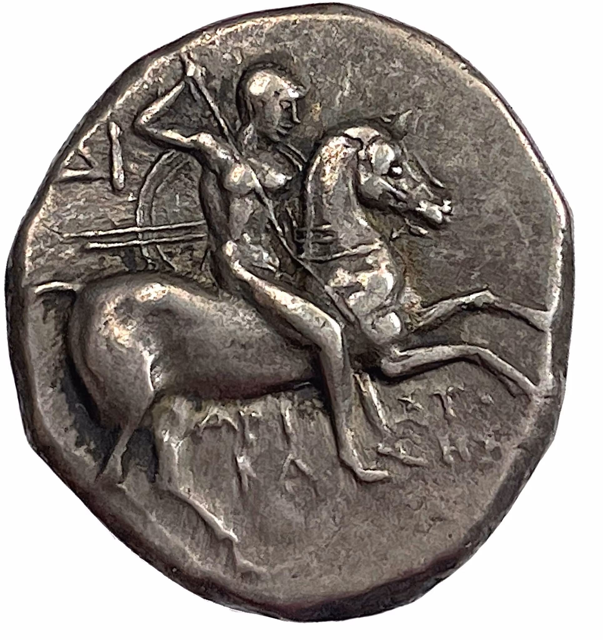 På åtsidan naken ung man sittande på häst med spjut i handen. Under hästen magistratens namn: "ARISTOKLES" (skrivet på grekiska). På frånsidan Taras sittande på delfin med treudd i handen. Under delfinen statsstatens namn: "TARAS" (skrivet på grekiska). Bakom Taras ett nymfhuvud. Tilltalande exemplar med lyster. Silver, 6.29g, 19.8mm. HN Italy 1033, kvalitet 1+/01