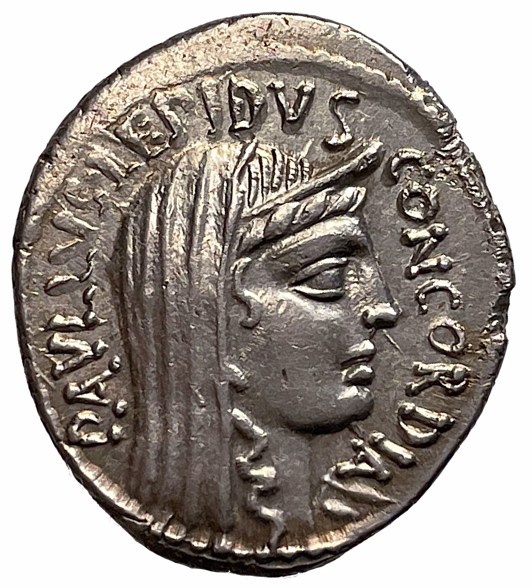 På åtsidan avbildas Conkordia beslöjad och bärande diadem samt omskriften: "PAVLLVS LEPIDVS CONCORDIA". På frånsidan en militär trofé i centrum med tre fångar stående till vänster och konsul Lucius Aemilius Paullus iklädd toga stående till höger. " TER" ovanför trofen och i avskärningen: "PAVLLVS". Crawford 415/1, 3.82g, 20mm, 6h. Ett helt orört mynt. Mint State, kvalitet 01/0. Ett mynt av stort historiskt intresse.