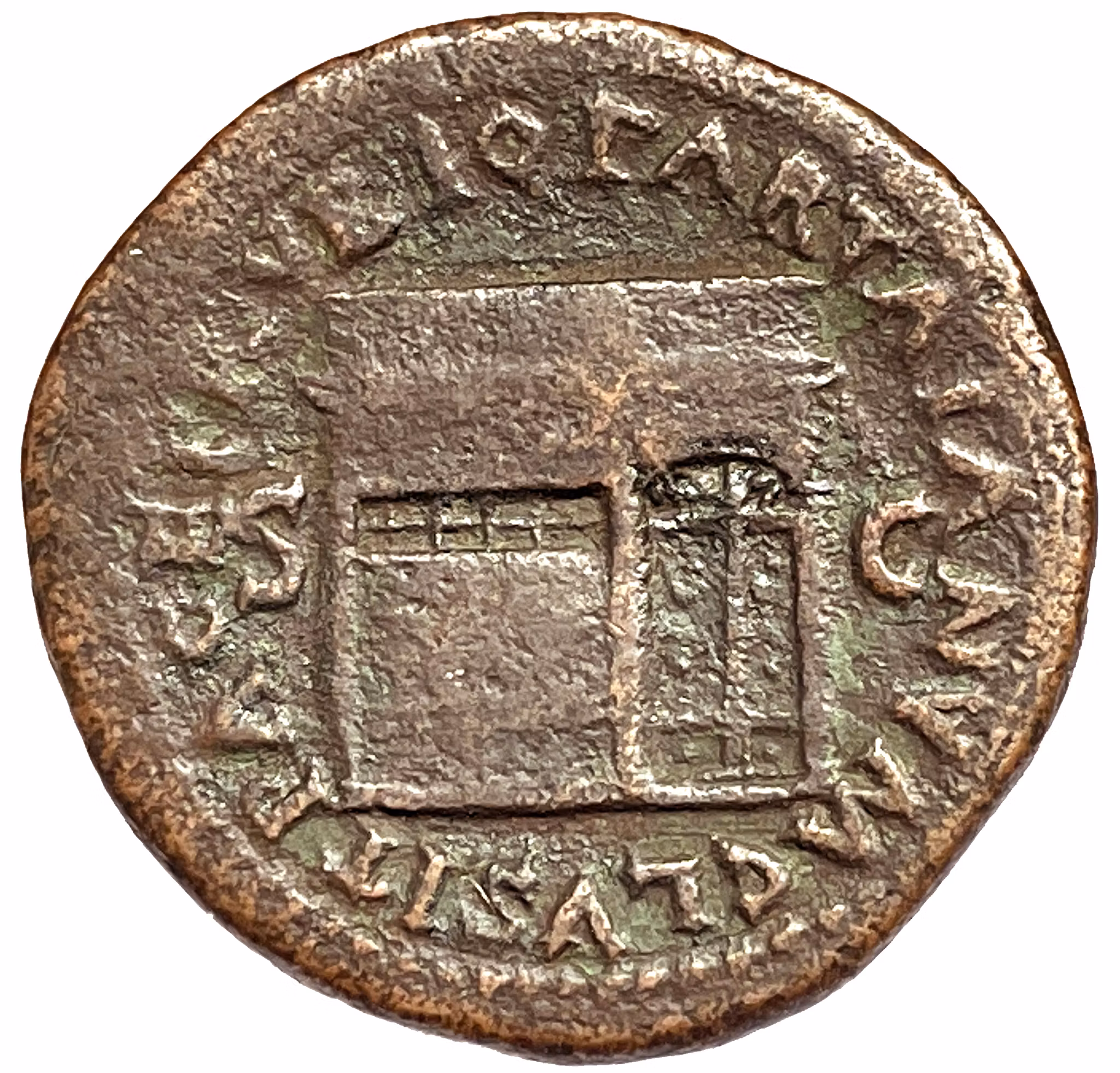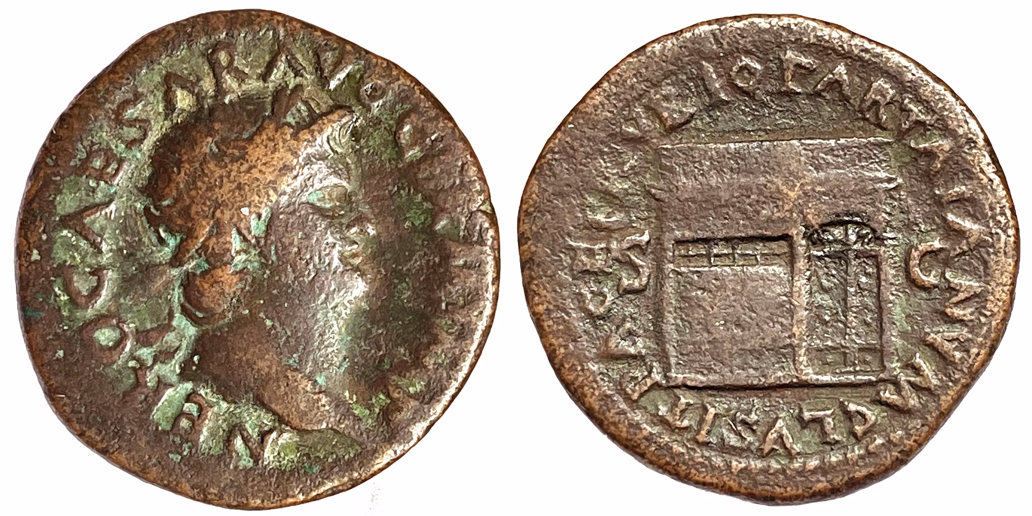 As. På åtsidan Neros högervända lagerkrönta bild och på frånsidan Janustemplet.En intressant mynttyp där man firade fred i riket genom att hålla dörrarna till templet stängda. Kvalitet 1)(1/1+, 10.07g, 27mm