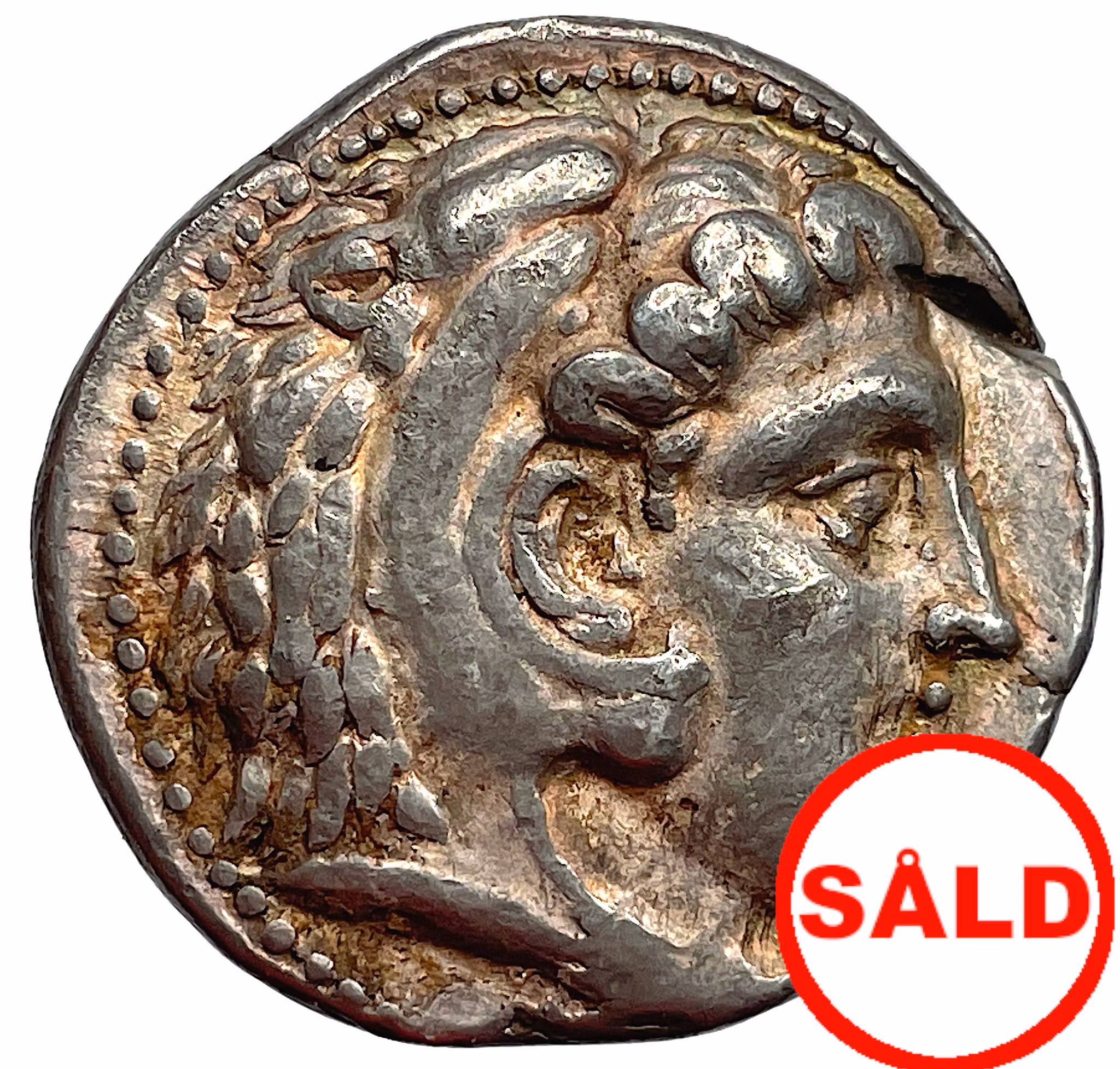 Tetradrachm i Alexanders den stores stil. På åtsidan Alexander den store som Herakles och på frånsidan Zeus tronande. På grekiska SELEUKOS BASILEOS (Kung Seleukos). Ett obetydligt testmärke på åtsidans kant, knappt märkbart. Fin lyster och utprägling. Silver, 16.71g, ca 25mm, kvalitet 1+/01