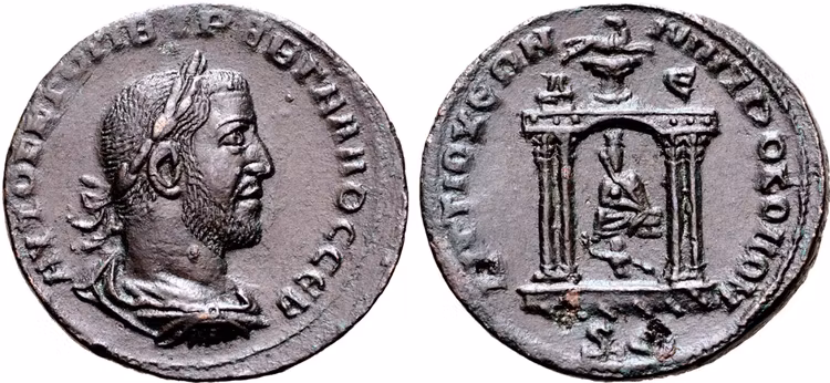 Brons 32mm. Ett ocirkulerat toppexemplar med knivskarpa detaljer och fantastisk bottenlyster. Mycket sällsynt att finna ett sådant mynt i detta skick. Präglad 215-253 e.Kr. På åtsidan avbildas kejsarens högervända lagerkrönta bröstbild samt omskriften: "ΑΥΤΟΚ Κ Γ ΟΥΙΒ ΤΡЄΒ ΓΑΛΛΟϹ ϹЄΒ". På frånsidan ett tempel med stadsgudinnan tronande på en sten. Nedanför flodguden Orontes simmande och ovanför templet en bagge sprongande åt höger. I omskriften: "ΑΝΤΙΟΧЄΩΝ ΜΗΤΡΟ ΚΟΛΩΝ, Δ-Є" och i avskärningen "SC".