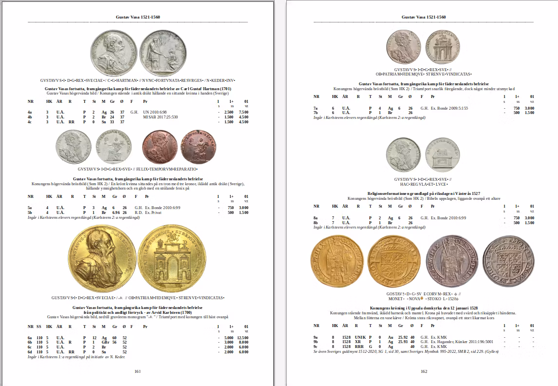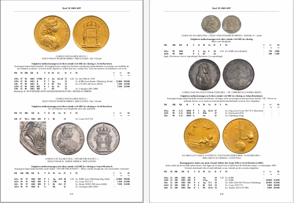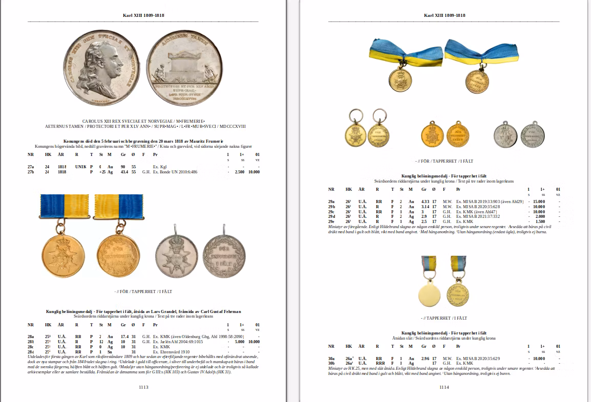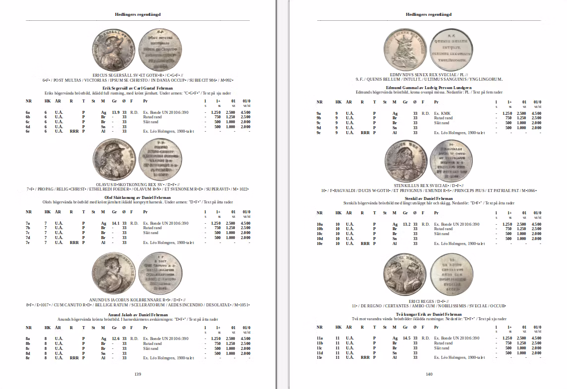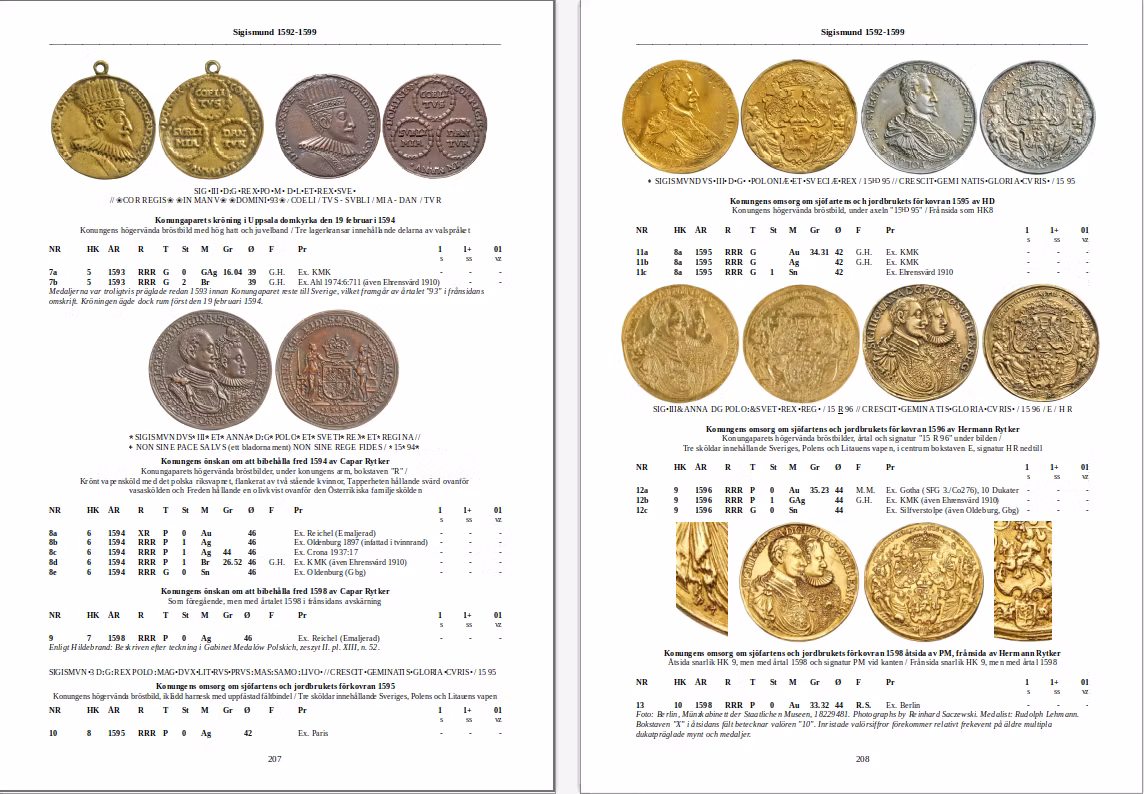 Äntligen efter 150 års väntan! Det första verket över Sveriges kungliga medaljer författades av Bror Emil Hildebrand och utkom i två volymer 1874 och 1875. Nu, för första gången någonsin finns en uppföljare, uppställd efter Hildebrand, men kraftigt utvidgad med många nya tillägg. Precis som Hildebrand i två volymer (totalt ca 1400 sidor). Flera helt nya register har introducerats; register över samtliga förekommande gravörer, register över omskrifter med översättningar av latinet, register över grafiska element och ligaturer. Fullt illustrerad i färg, A4-format, med många detaljförstoringar. För att belysa sällsyntheten har jag genomfört en omfattande inventering som tagit sin början i de större samlingarnas försäljningar från andra halvan av 1800-talet, men givetvis omfattar inventeringen även de flesta moderna försäljningar fram till idag. Även här presenteras för första gången en sammanhållen beskrivning av medaljernas sällsynthet, vilket ackompanjeras av tentativa värderingspriser och raritetsbeteckningar. En egen löpnumrering har införts där givetvis konkordans till Hildebrand och andra specialverk inom medaljområdet ges.