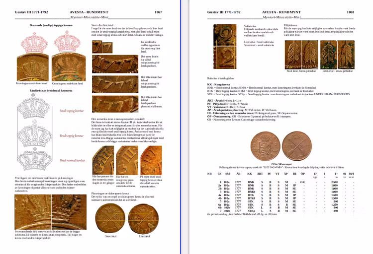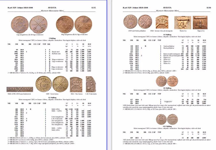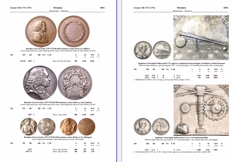 För första gången i den numismatiska historien publiceras boken över alla svenska silver och kopparmynt med värderingspriser. Titeln trycks i färg om totalt ca 1400 sidor (två volymer), inbuden, A4 i färg, 6 kg numismatiskt sprängstoff. Böckerna katalogiserar samtliga rikssvenska mynt från vikingatid, medeltid och fram till idag, mynt präglade och utgivna i Sveriges besittningar (Tyskland & Baltikum) samt Hessen-Kassel under Fredrik I:s tid (1730-1751), dessutom ett urval kungliga såväl som personmedaljer. Genom att sammanföra fyra samlarområden i en och samma katalog blir bilden över den svenska numismatiken tydlig.