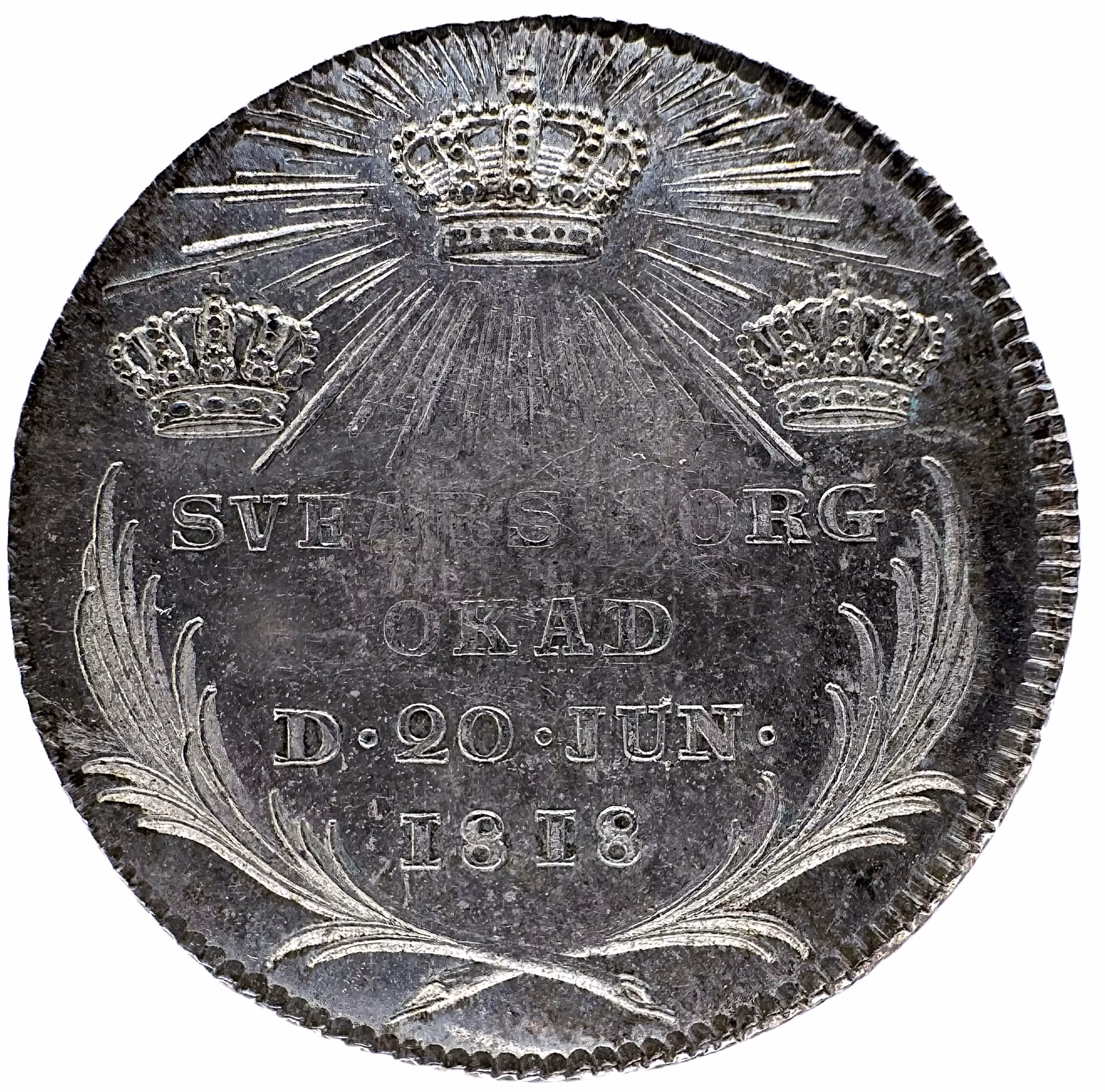 När man betraktar denna 1/3 riksdaler från 1818, med dess frostade relief och djupa bottenglans, möter man ett objekt som präglats i en stund av nationell melankoli. Myntet utgavs till minne av Hedvig Elisabeth Charlottas död den 20 juni 1818, endast några månader efter hennes gemål Karl XIII:s bortgång. För eftervärlden är hon inte främst ihågkommen som den livliga tyska prinsessan från Eutin, utan som den skarpsynta krönikören som genom sina omfattande dagböcker gav röst åt den gustavianska tidens innersta väsen.