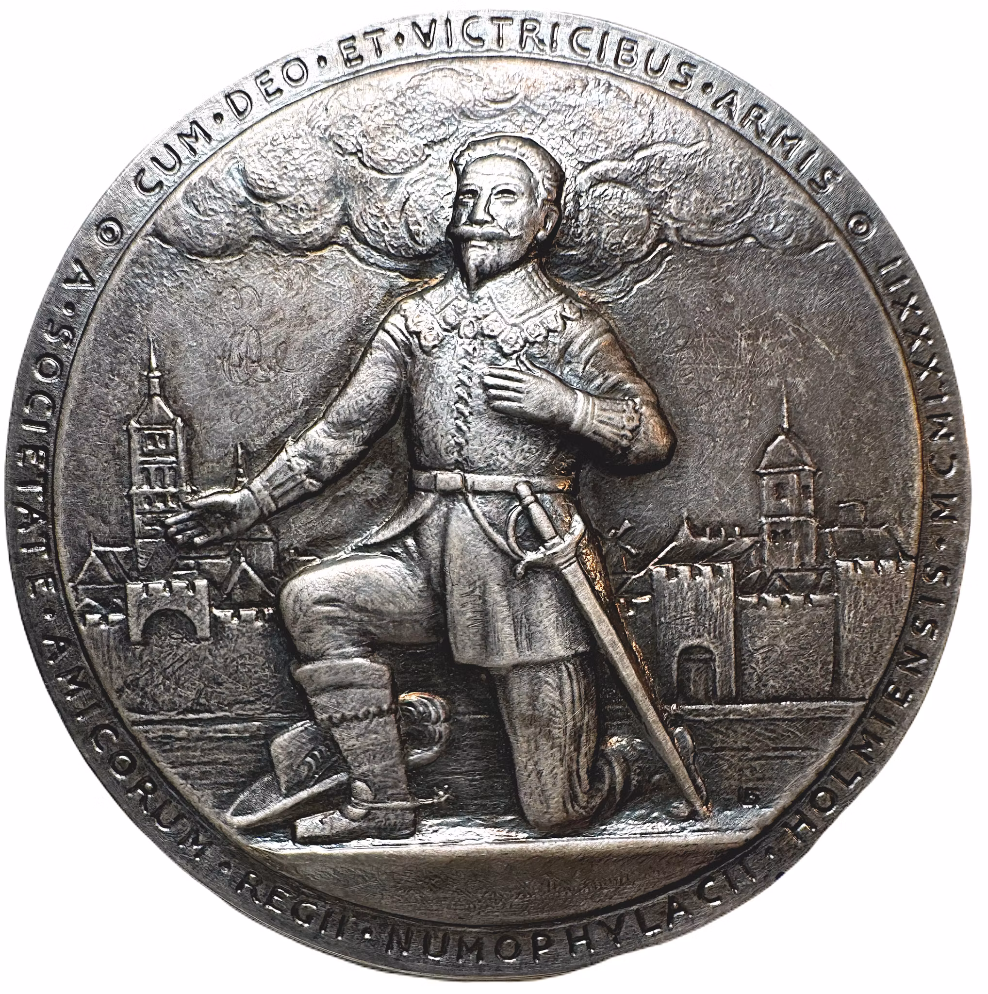 Konungen stående knäböjd, stadsbild i bakgrunden. I omskriften: "CUM•DEO•ET VICTRICIBUS• ARMIS• / A•SOCIETATE•AMICORUM•REGII•NUMOPHYLACII•HOLMIENSIS•MCMLXXXII". Den latinska texten översatt lyder: "Med Gud och segrande vapen / Från Föreningen av vänner till Kungliga Myntkabinettet i Stockholm, 1982."