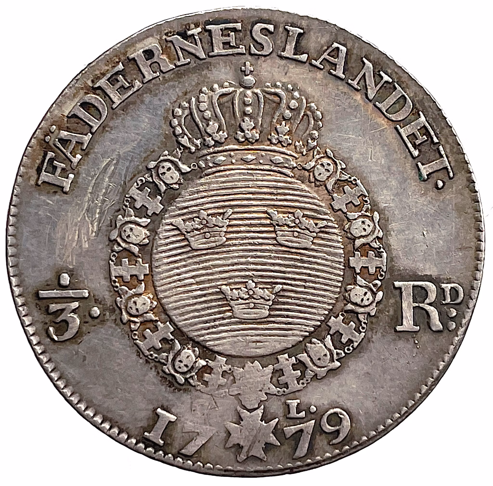 Gustav III - 1/3 Riksdaler 1779 - RAR 0 kr 2 950 kr Gustav III - 1/3 Riksdaler 1779 - RARKvalitet 1+, lätta plantsrispor, repor i frånsidans fält och delvis svagt utpräglad, SMB 45, 9.64g, 30mm