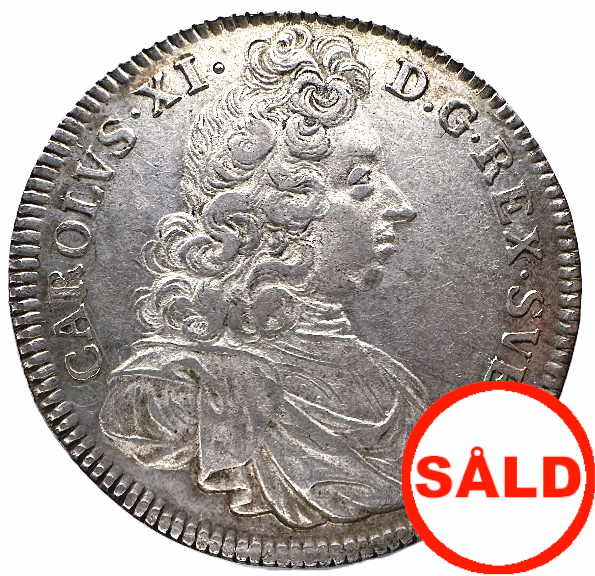 Konungens högervända bröstbild iklädd manteldraperat harnesk. Bärande sedvanlig barockperuk med långt utslaget lockigt hår. I omskriften: "CAROLVS · XI · D · G · REX · SVEC ·. Denna latinska inskription är en förkortning för Carolus XI, Dei Gratia, Rex Sveciae, vilket på svenska betyder Karl XI, med Guds nåde, Sveriges konung. Omskriften avslutas med en liten ros som är gravören Arvid Karlsteens gravörsymbol.