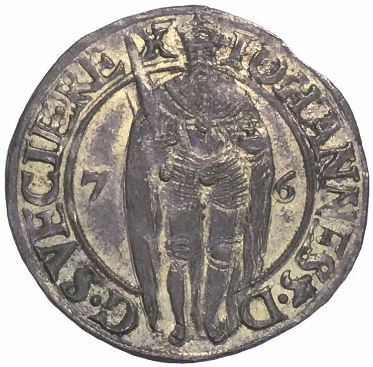 Konungen i helfigur, krönt, hållande svärd och riksäpple, i fälten årtalssiffrorna 7-6. I omskriften: "IOHANNES•3•D•G•SVECIE•REX"