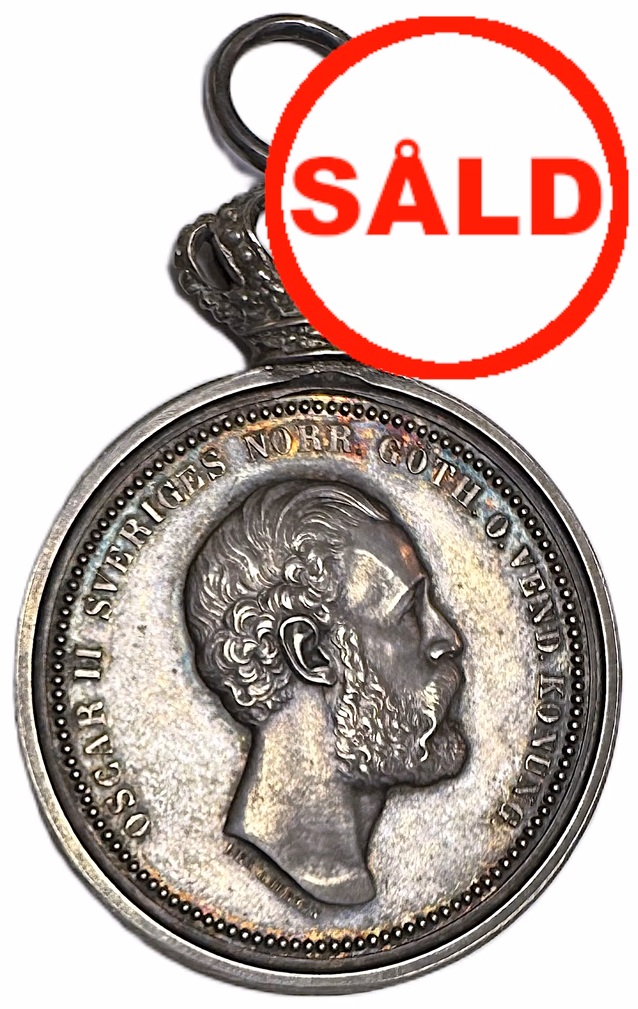Belöning i form av medaljer och skådegåvor har alltid varit en viktig del av sällskapets verksamhet. Redan 1802 fick det rätt att prägla egna medaljer med kungens bild, en tradition som lever vidare än i dag. Den här medaljen, präglad under Oscar II:s regeringstid, bär på åtsidan hans porträtt med texten OSCAR II SVERIGES NORR. GOTH. O. VEND. KONUNG. Frånsidan visar ett symboliskt motiv med jordbrukets redskap, soluppgång och skepp – en allegori över arbete, handel och framsteg. Ovanför pryds medaljen av en genombruten kunglig krona, en detalj som understryker dess högtidliga karaktär.