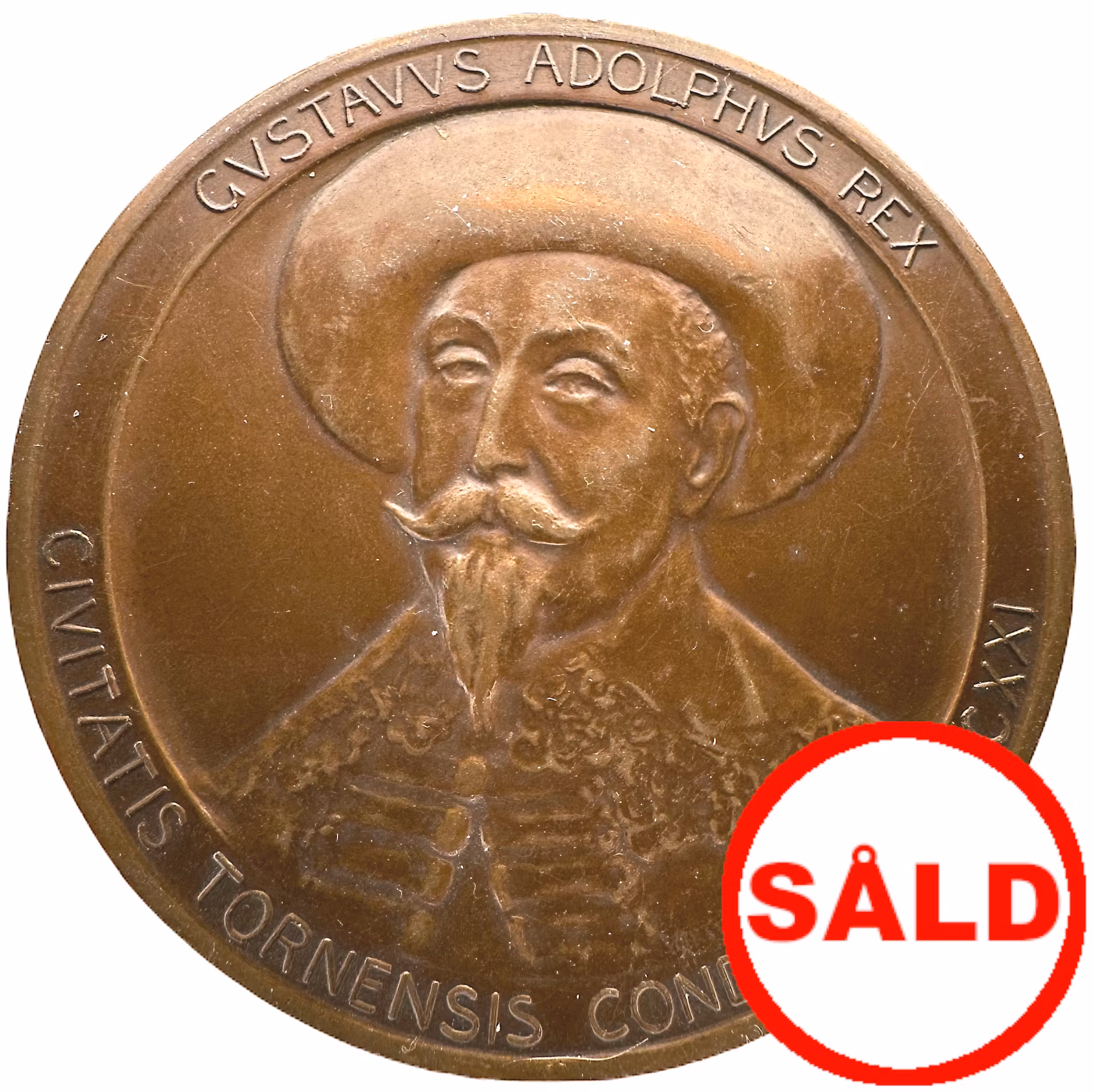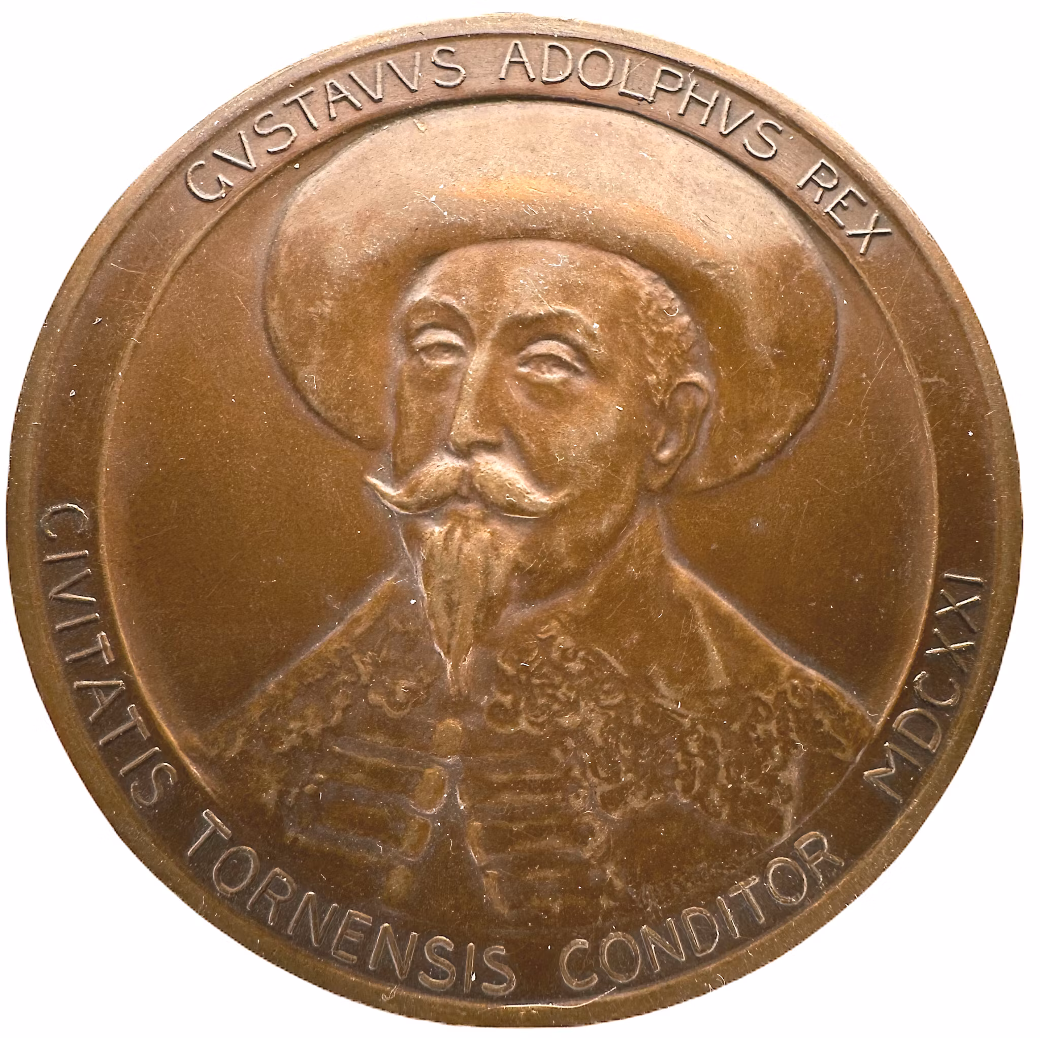 Kunges nästan helt framvända bröstbild, vänd åt vänster. Under bilden, gravörens namn: "Wikström 1921". I omskriften: "GVSTAVVS ADOLPHVS REX / CIVITATIS TORNENSIS CONDITOR MDCXXI"