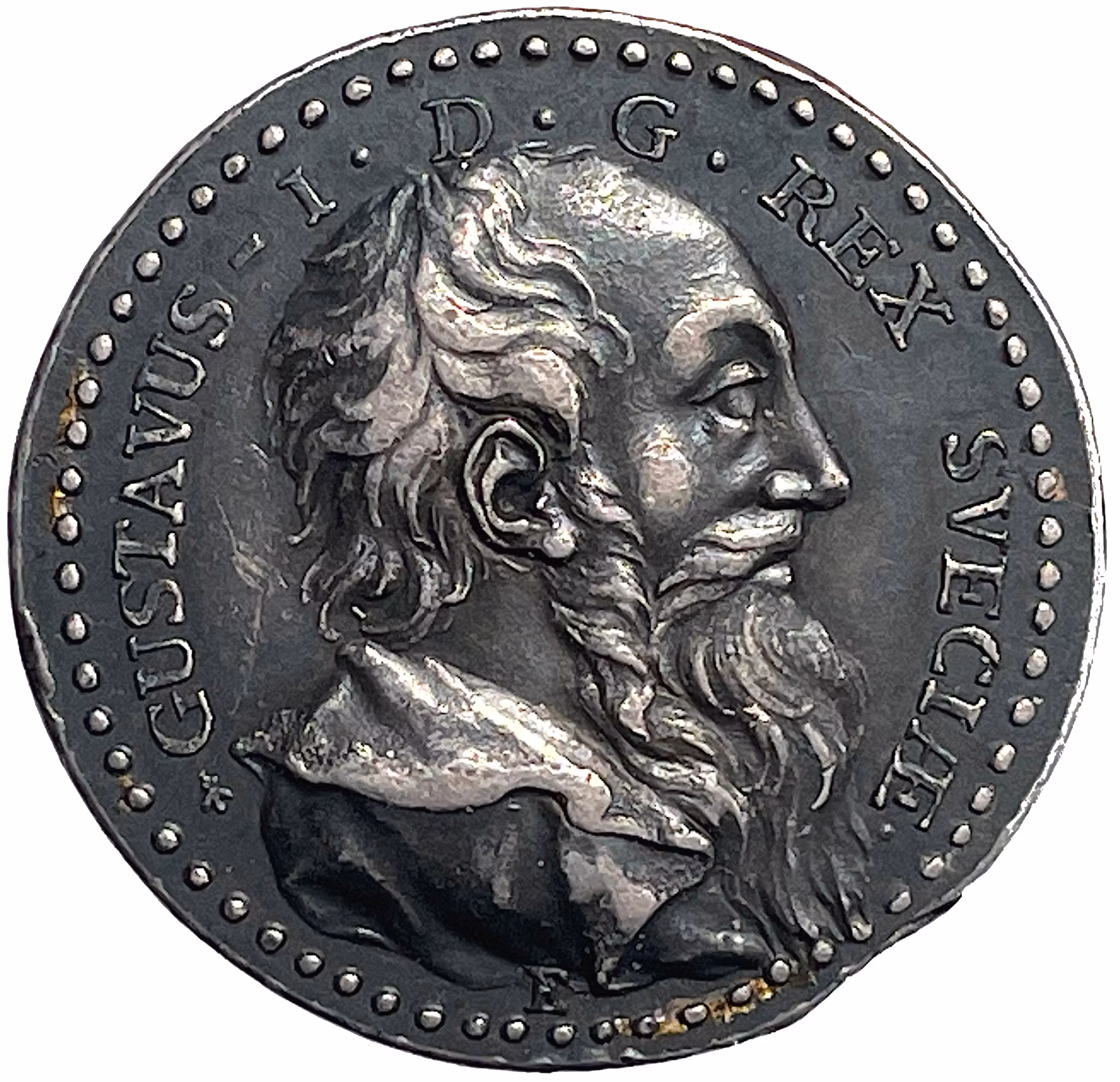 Gustav Vasas högervända bröstbild, under bilden gravörens initial: "E". I omskriften: "GUSTAVUS - I•D•G•REX SVECIÆ•"