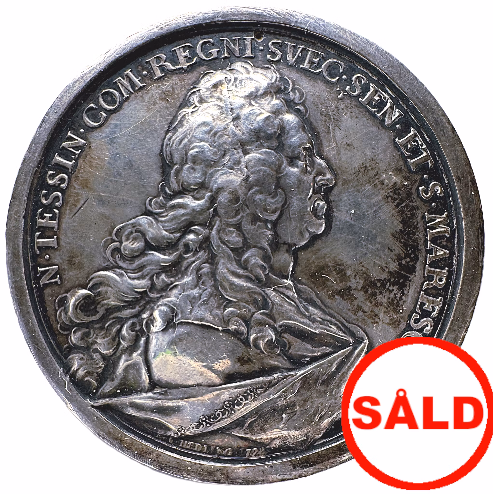 Tessins högervända bild samt omskriften : "N • TESSIN • COM• REGNI• SVEC• SEN• ET• S• MARESCH• ". Längst ned gravörens namn och årtal: " I• C• HEDLINGER• 1728• "