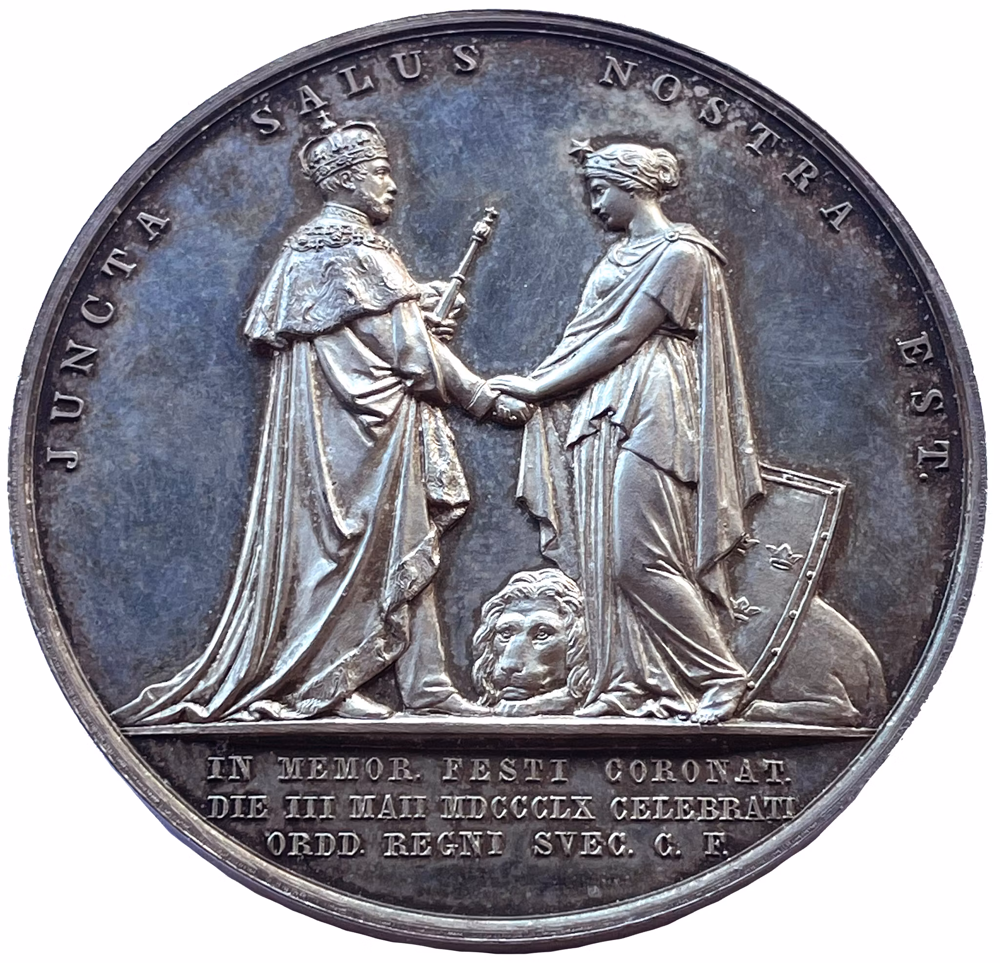 Kröningsakten förrättades av ärkebiskopen Henrik Reuterdahl, som jämte statsministern Louis De Geer påsatte konungens och jämte f. d. statsrådet Johan Fredrik Fåhræus drottningens krona. Rikets Ständers hyllning skedde den 5 maj på slottsbacken framför obelisken. Ett ocirkulerat praktexemplar med frostad relief och djupt spegelglänsande fält, underbar guldskimrande patina. Kvalitet 01/0. Hildebrand 5, 93.63g, 57mm. Graverad av Johan Edvard Ericsson efter professor C. G. Qvarnströms modell.