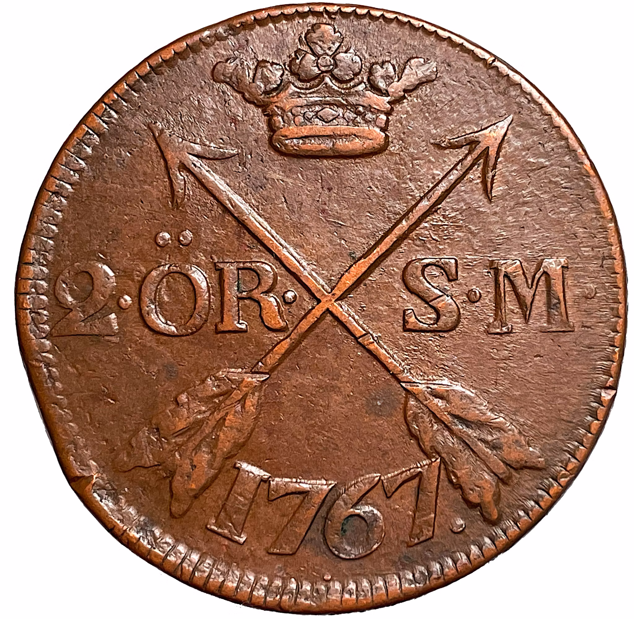 Adolf Fredrik - 2 Öre SM 1767 - Ovanligt vackert exemplar Produkten är tyvärr slut i lager. :( Adolf Fredrik - 2 Öre SM 1767 - Ovanligt vackert exemplarKvalitet 1+/01, SMB 193, 26.9g, 34mm, obetydlig fläck