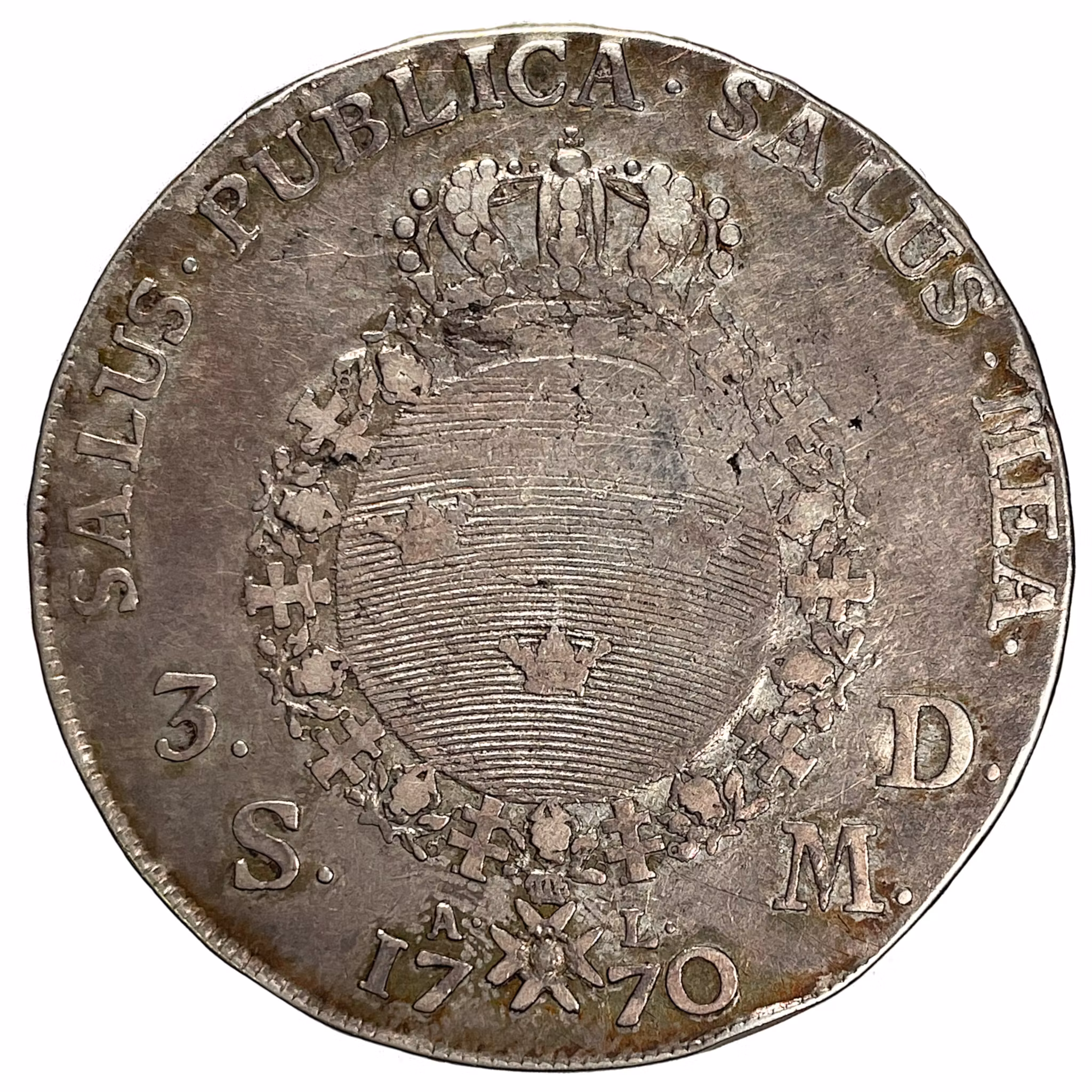 Adolf Fredrik, 3 Daler SM 1770 med 9 Serafer Produkten är tyvärr slut i lager. :( Adolf Fredrik, 3 Daler SM 1770 med 9 SeraferKvalitet god 1, SMB 27