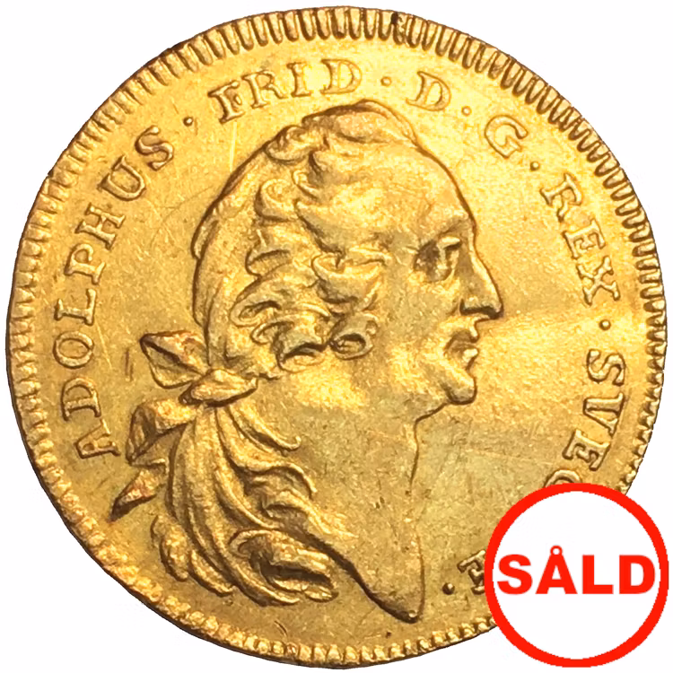 Ett tillfälle att förvärva en riktigt sällsynt dukat från Adolf Fredrik. Vi känner till totalt 13 exemplar i privata samlingar. Ett mycket tilltalande porträtt, något svagare frånsida, minder märken, kvalitet 1+/01)(1+, guld, SG 13, 3.45g, 21.91mm (såld)