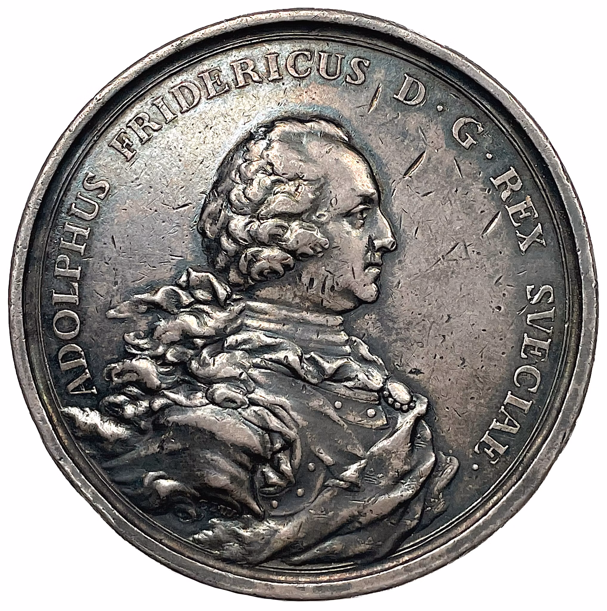 Konungens högervända bröstbild i full kröningsskrud samt omskriften: "ADOLPHUS FRIDERICUS, D G REX SVECIAE" som översatt betyder: "Adolf Fredrik, med Guds nåde konung av Sverige". Under konungens bild gravörens initialer "D.F."