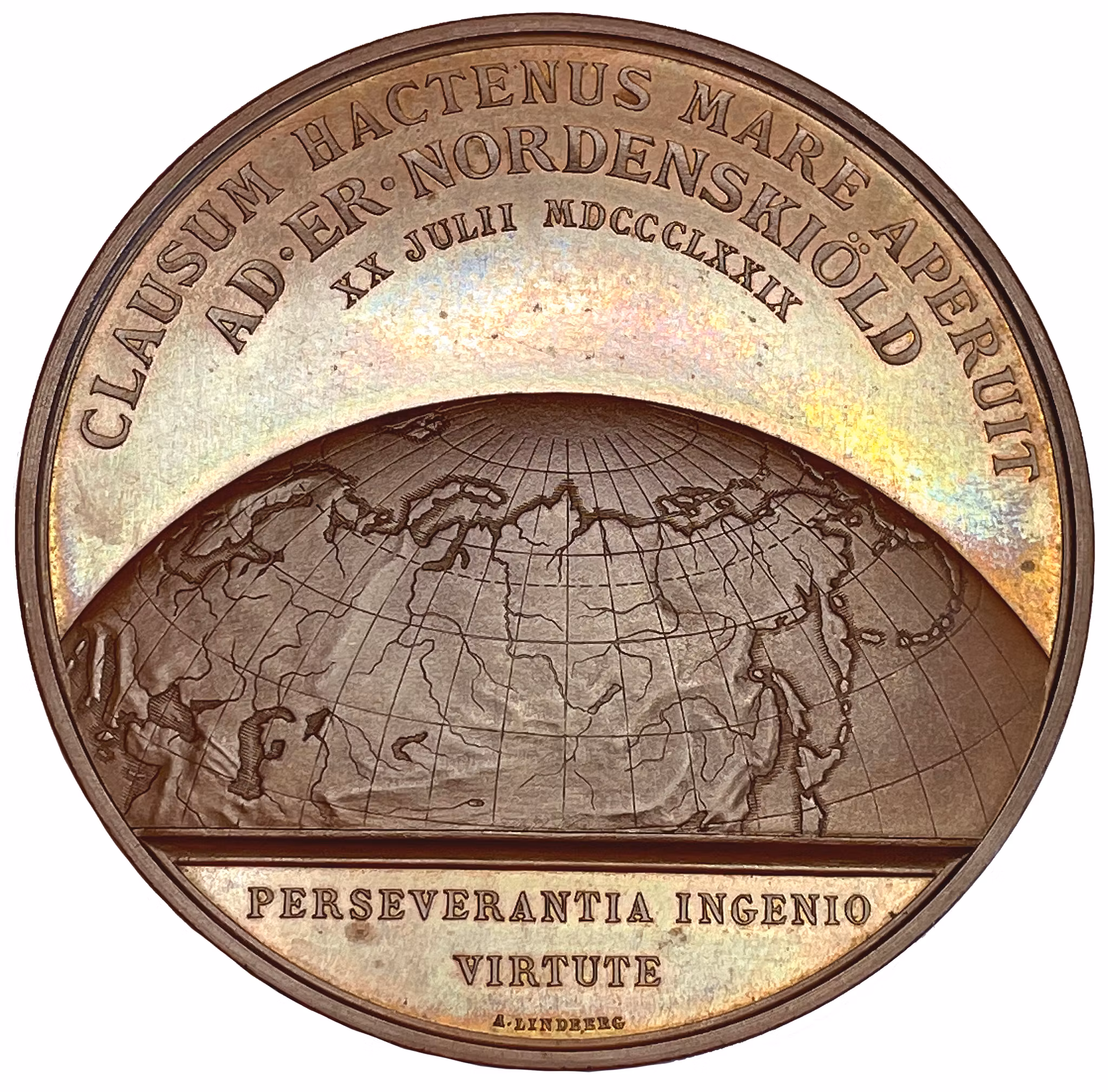 En del av norra jordklotet, med kusten från Nordkap till Behringssund. Ovanför på tre rader: "CLAUSUM HACTENUS MARE APERUIT / AD. ER. NORDENSKIÖLD / XX JULII MDCCCLXXIX". I avskärningen: "PERSERVERANTIA INGENIO VIRTUTE" och underst gravörens namn: "A. LINDBERG". Fritt översatt lyder devisen: "Uthållighet, styrka och intelligens"