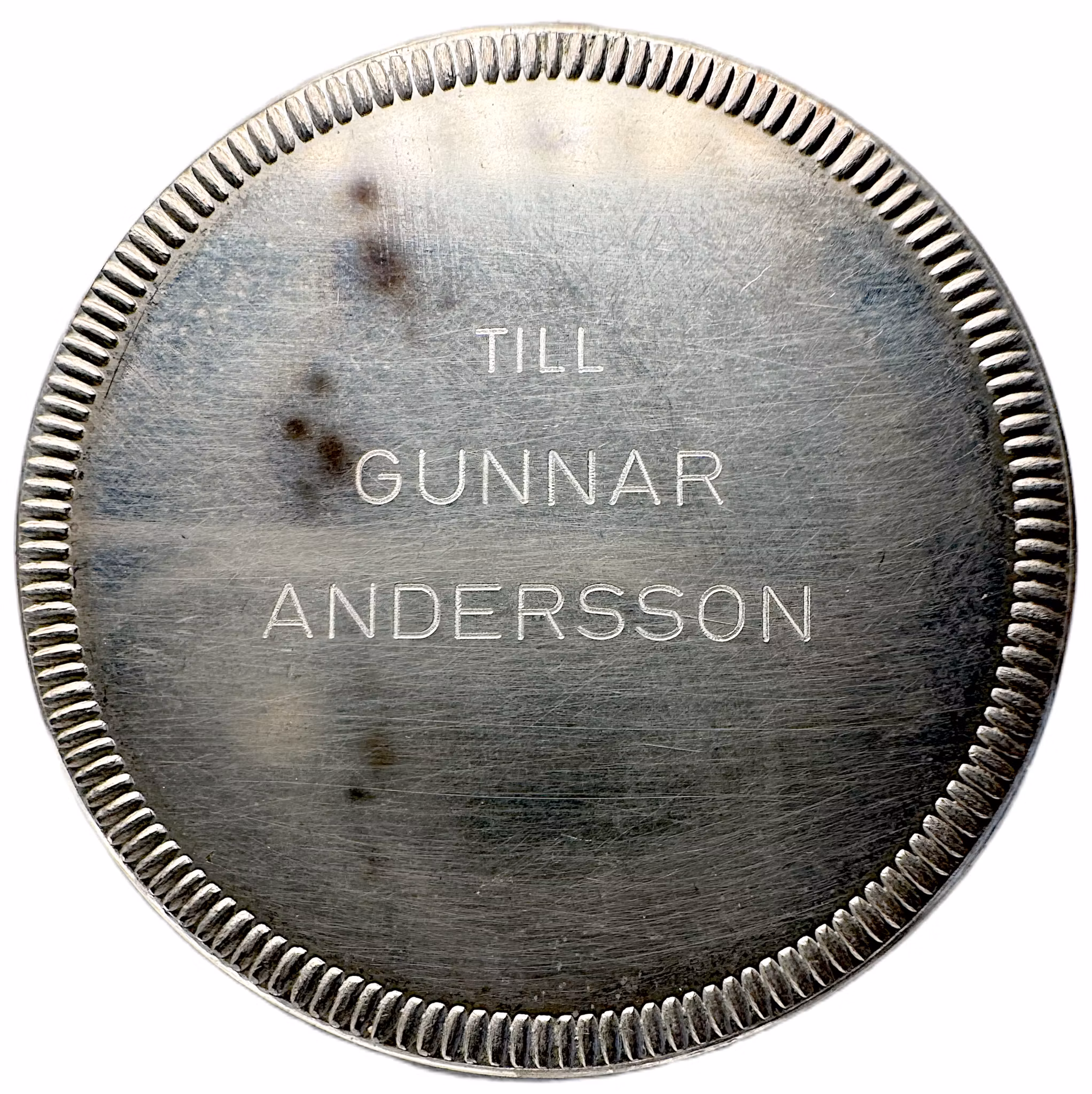 Frånsidan är strikt och avskalad för att ge plats åt den personliga utmärkelsen. På en helt slät botten, som omges av samma kraftiga, strålformade ram som åtsidan, står en graverad dedikation i tre raka rader: "TILL / GUNNAR / ANDERSSON". Fältet uppvisar några lätta, naturliga ojämnheter i patinan.