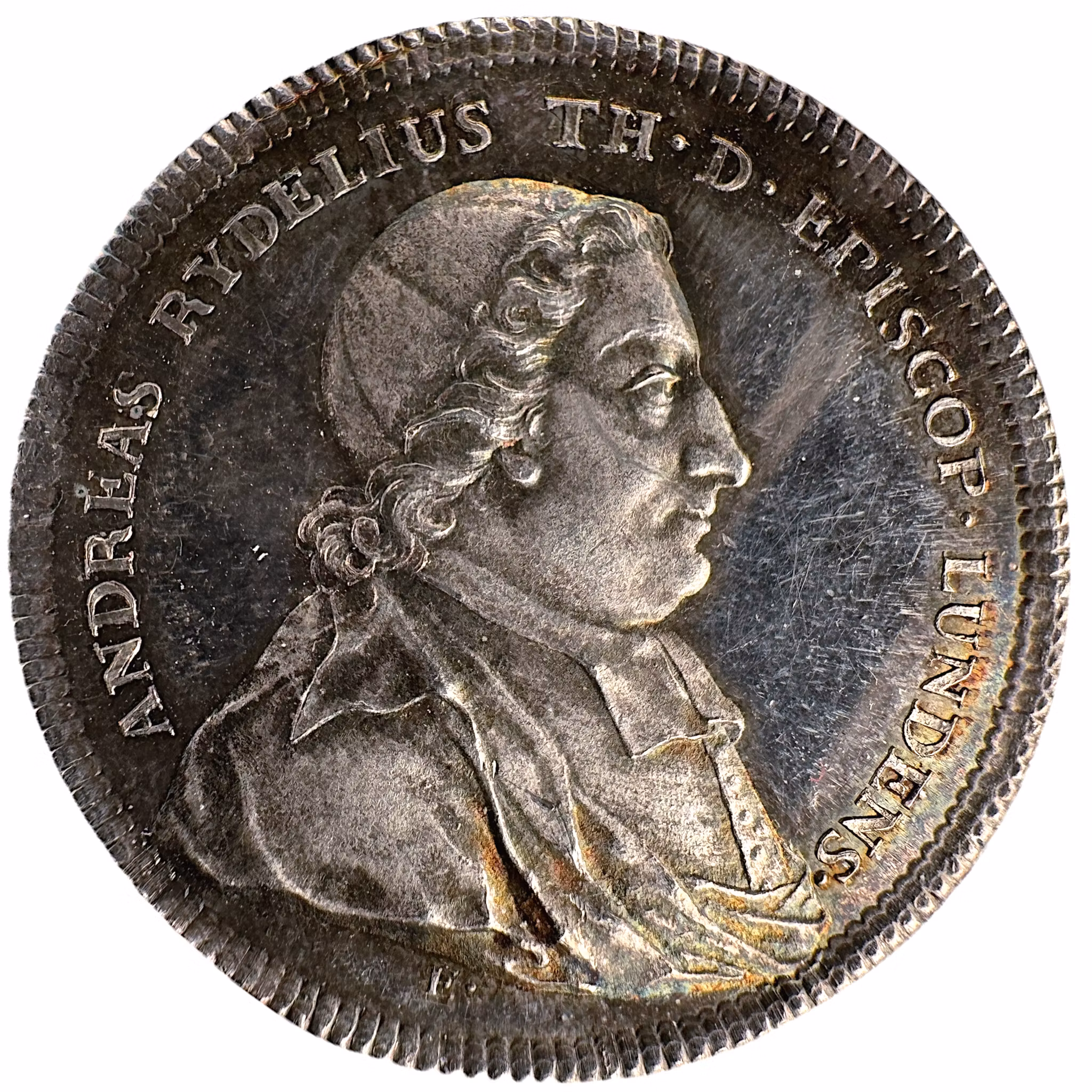 Rydelius högervända bröstbild, under bilden gravörens initial "E". I omskriften: "ANDREAS RYDELIUS TH. D. EPISCOP LUNDENS"