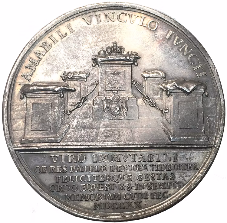 En riktigt stor och läcker medalj, graverad av en av vår tids största medaljgravörer, Hedlinger. Medaljen mäter hela 63.42mm i diameter och väger 90.22g. Åtsidan avbildar kanslipresidenten Arvid Horn, undertill gravörens namn "I. HEDLINGER". På frånsidan avbildas ett altare i centrum med konung Fredrik I:s riksregalier. 63,42 mm; 90,22 g. Felder 34; Hildebrand S. 123, 2. Vacker patina, mindre märke på kanten, kvalitet nära 01