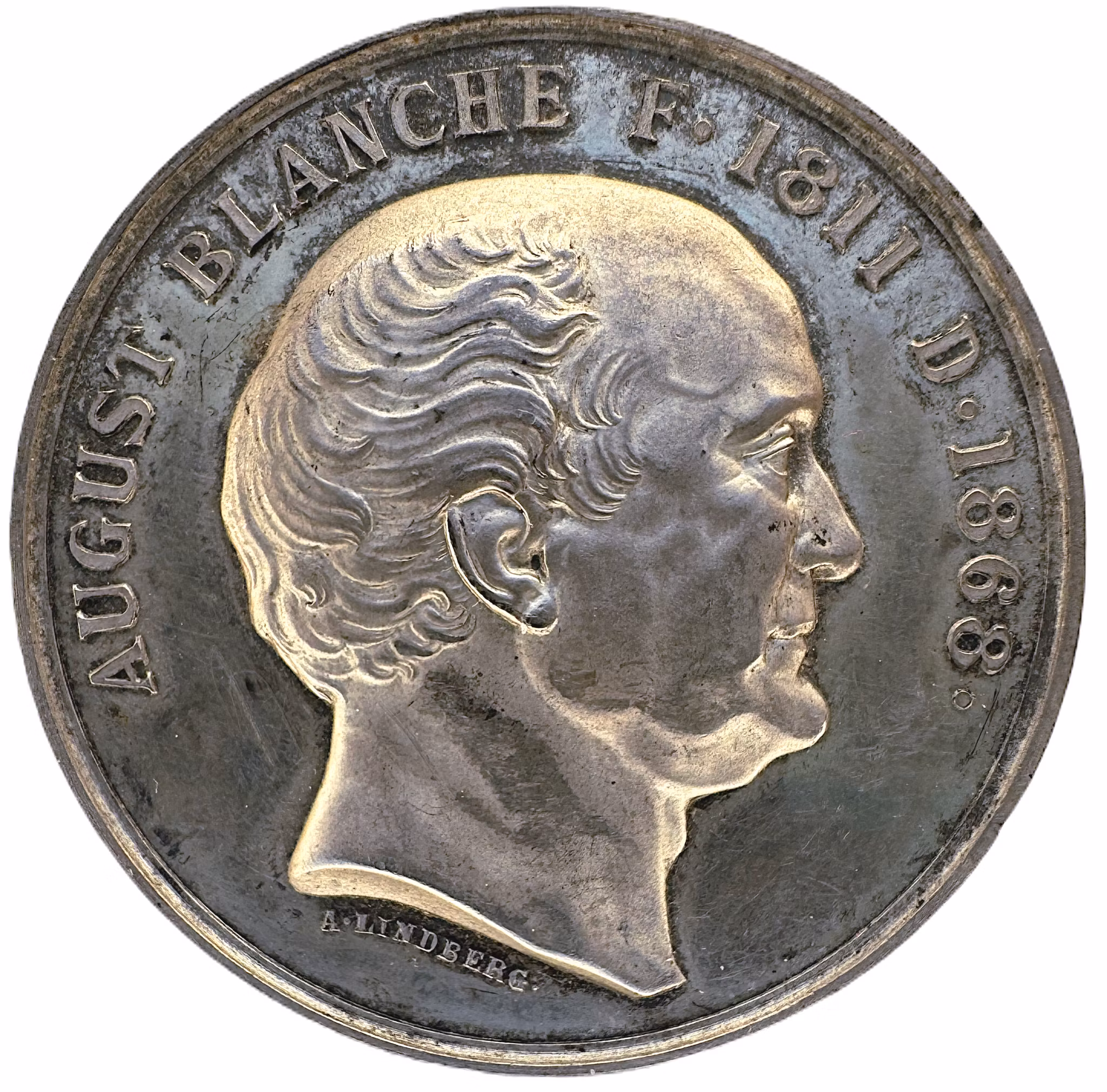 Blanches högervända bild med gravörens namn under bilden: "A.LINDBERG.". I omskriften: "AUGUST BLANCHE F. 1811 D. 1868."