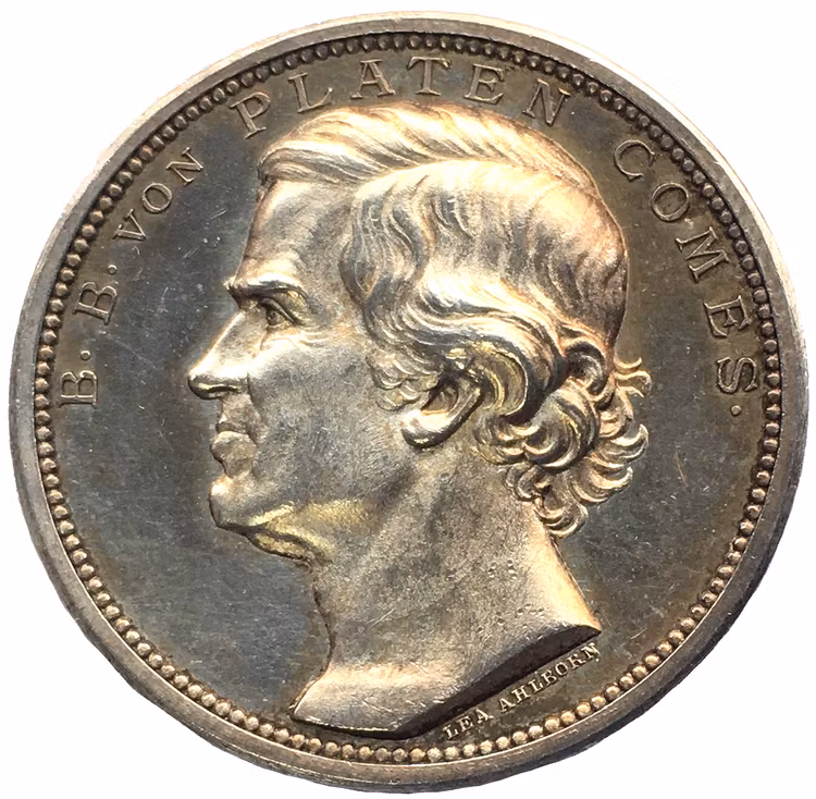 Kanalbyggaren, statsrådet, sjömilitären och riksståthållaren Baltzar von Platen är utan tvekan en av de personer som format den svenska historien. Han tillhörde den lilla inre krets som stod kungamakten nära och tog aktiv del i den svenska politiken. Dessutom genomförde han det väldigt Göta kanal-projektet. Vacker silvermedalj med frostad relief och djupt glänsande fält. Slagen 1886 av Svenska akademien. Grav. av Lea Ahlborn. Kvalitet 01, 14,45 gram. 31 mm. Ref: Hy. II, s. 81, 3; Olsén s. 296.