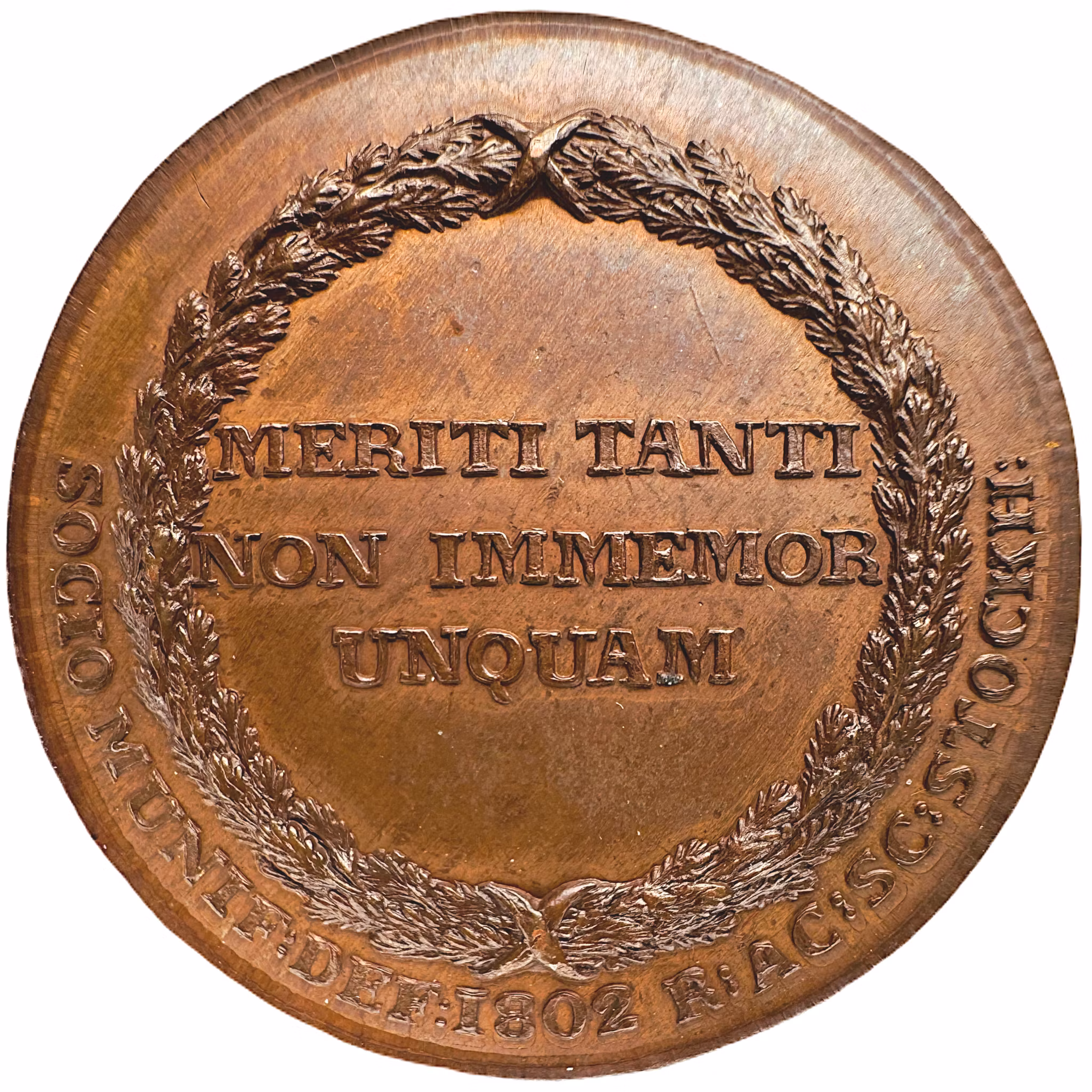 Text på tre rader inom en tät cypresskrans med i kors om slagna band, ett upptill och ett nedtill: "MERITI TANTI NON IMMEMOR UNQUAM". I omskriften: "SOCIO MUNIF: DEF: 1802 R: AC: SC: STOCKH:". Texten kan översättas som: "Aldrig glömmande en så stor förtjänst hos en generös donator. Till minne av hans bortgång år 1802. Kungliga Vetenskapsakademien i Stockholm."