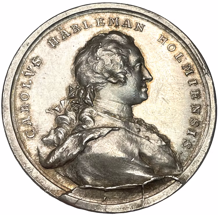 Carl Hårleman var en av sin tids mest tongivande arkitekter. Han var överintendent och huvudansvarig för färdigställandet av Stockholms slott efter Nicodemus Tessin d.y:s död 1728. Han var även en av grundarna av Kungliga Ritakademien och den som införde rokokon i Sverige. Ett mycket vackert exemplar med full prälgingsglans, tekniskt ocirkulerad med endast obetydliga märken av hantering, mindre stampskador. Utöver det här utbjudna exemplaret som ingick i greve Bondes omfattande samling (2010:6:736) har jag endast noterat ytterligare en försäljning under de senaste ca 20 åren. Silver. Kvalitet 01, RR, 30.10, 43mm. Hyckert I:184:8, felder 155.