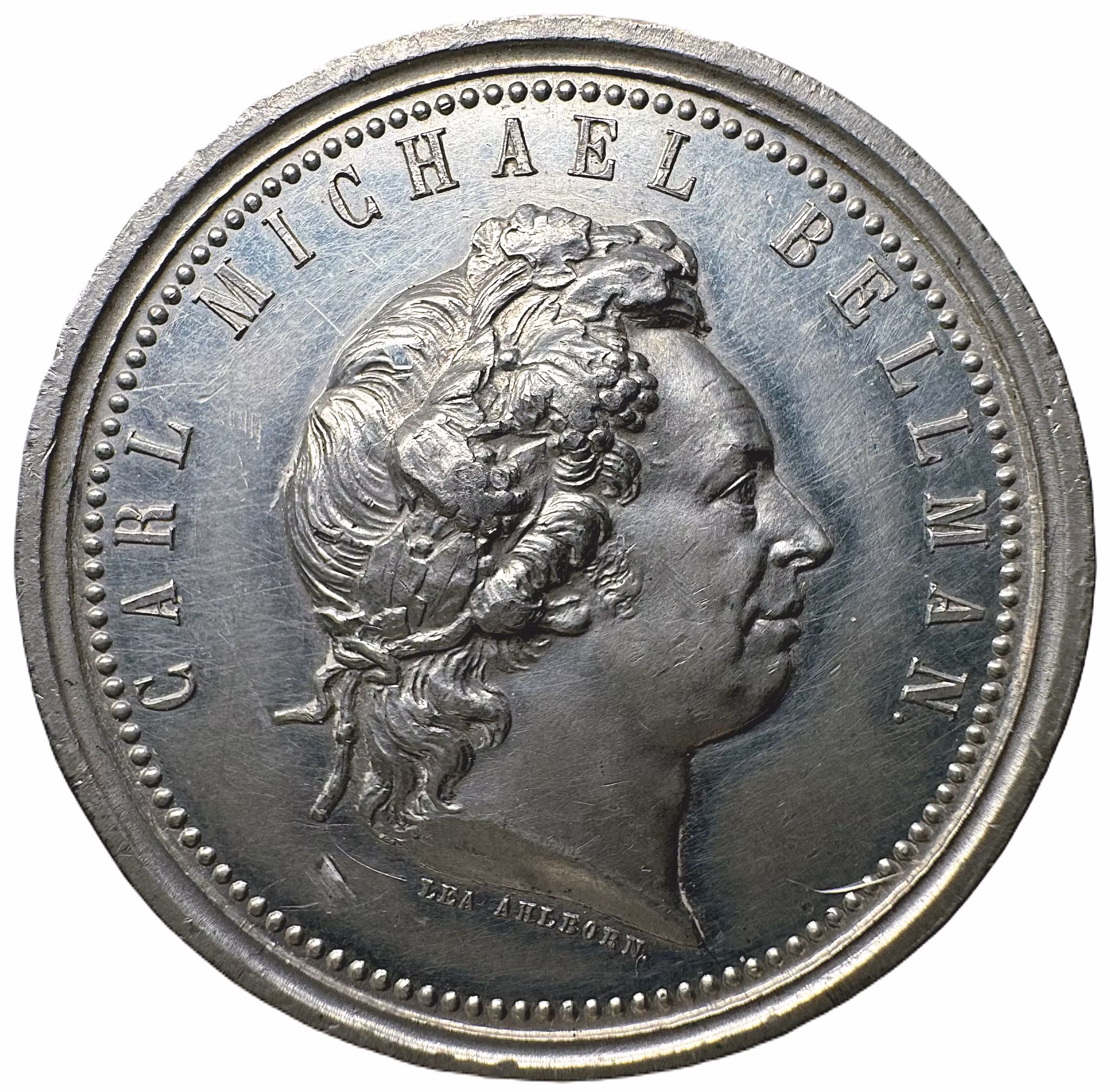 Bellmans högervända bild, i omskriften: "CARL MICHAEL BELLMAN." och nedanför bilden gravörens namn: "LEA AHLBORN.. Längs kanten en pärlrand.