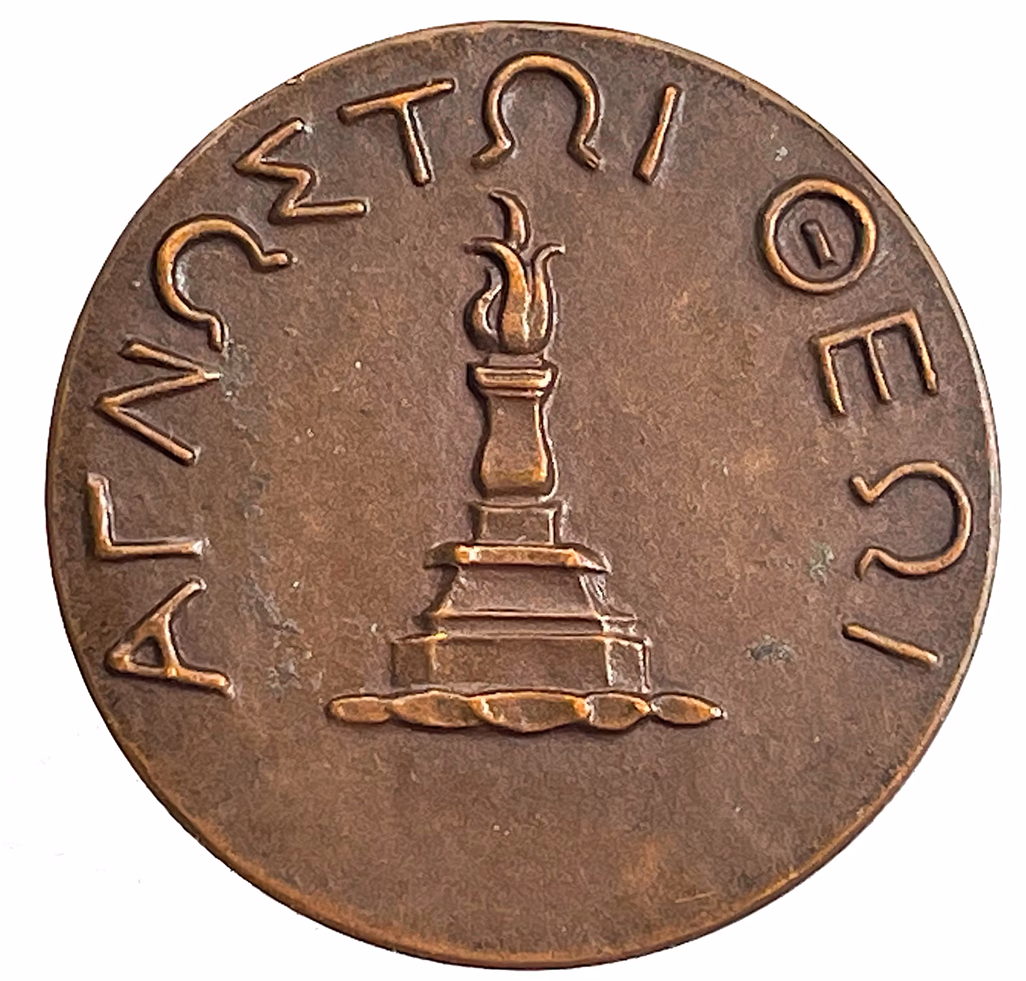 Ett altare med en flammande eld, samt omskrift på grekiska: "AΓNΩΣTΩI ΘEΩI" = åt den okände guden.