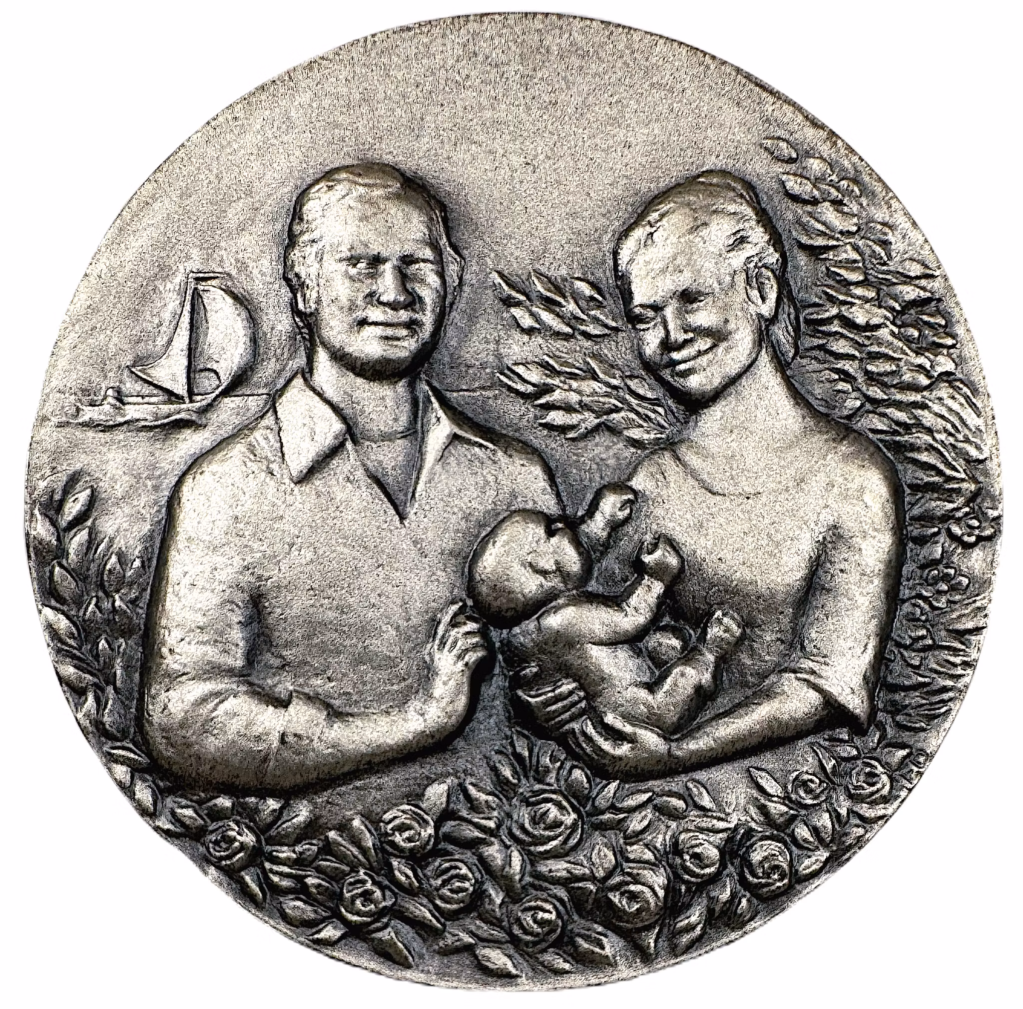 En härligt tung silvermedalj soim redan hunnit bli drygt 45 år gammal, men som betraktas som en modern utgåva. Det stora flertalet silvermedaljer är sannolikt också nedsmälta. Silver 925/1000, 59.43g, 45mm, kvalitet 01/0.