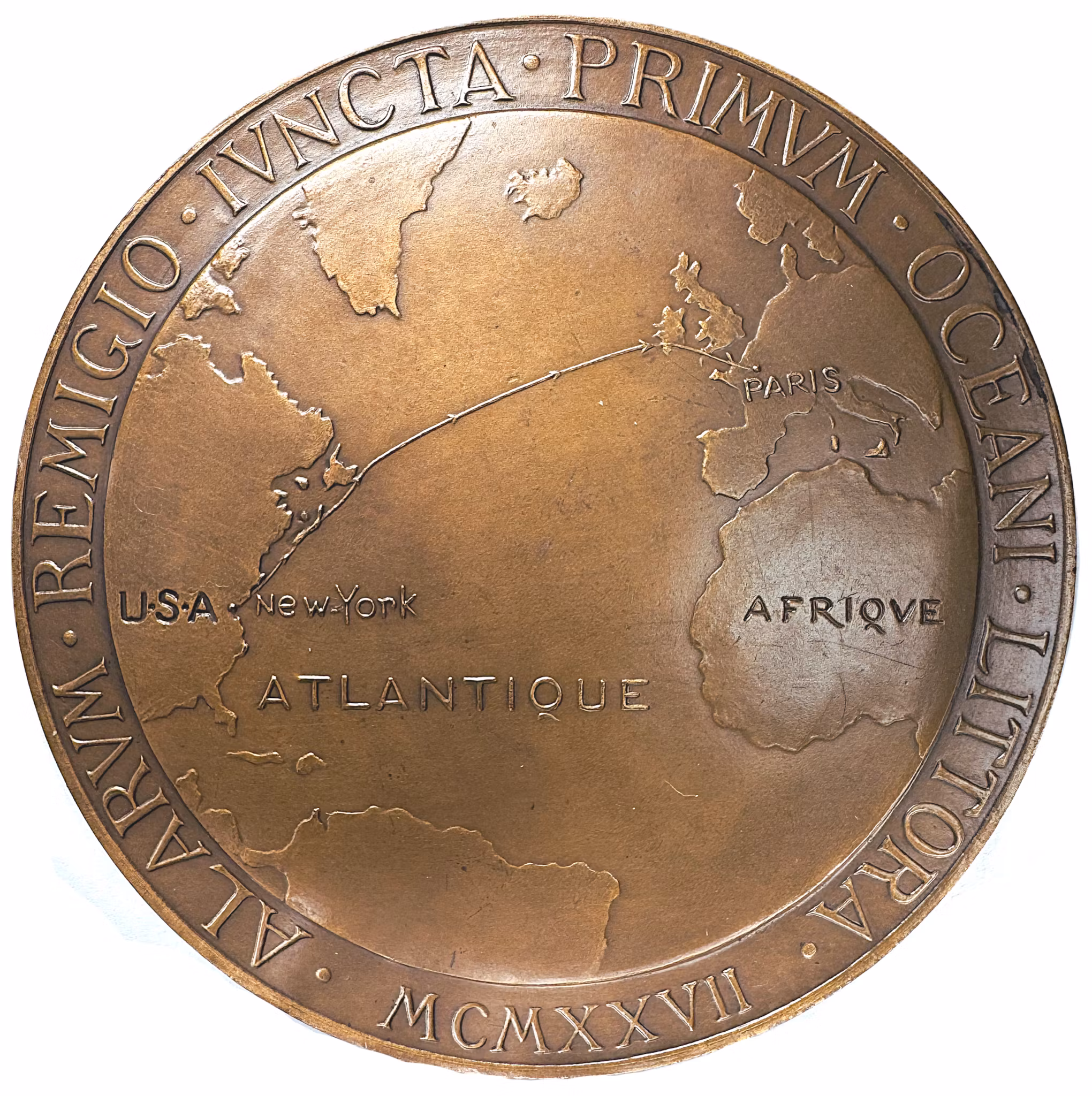 En kartbild samt Lindberghs flygrutt inplottad över atlanten. I omskriften: "ALARVM REMIGIO IVNCTA PRIMVM OCEANI LITTORA MXMXXVII". i TOLKNING OCH ÖVERSÄTTNING BLIR DEN LATINSKA TEXTEN: "För första gången förenade [han] havets stränder med vingarnas rodd, 1927." Där orden är tolkade och översatta: