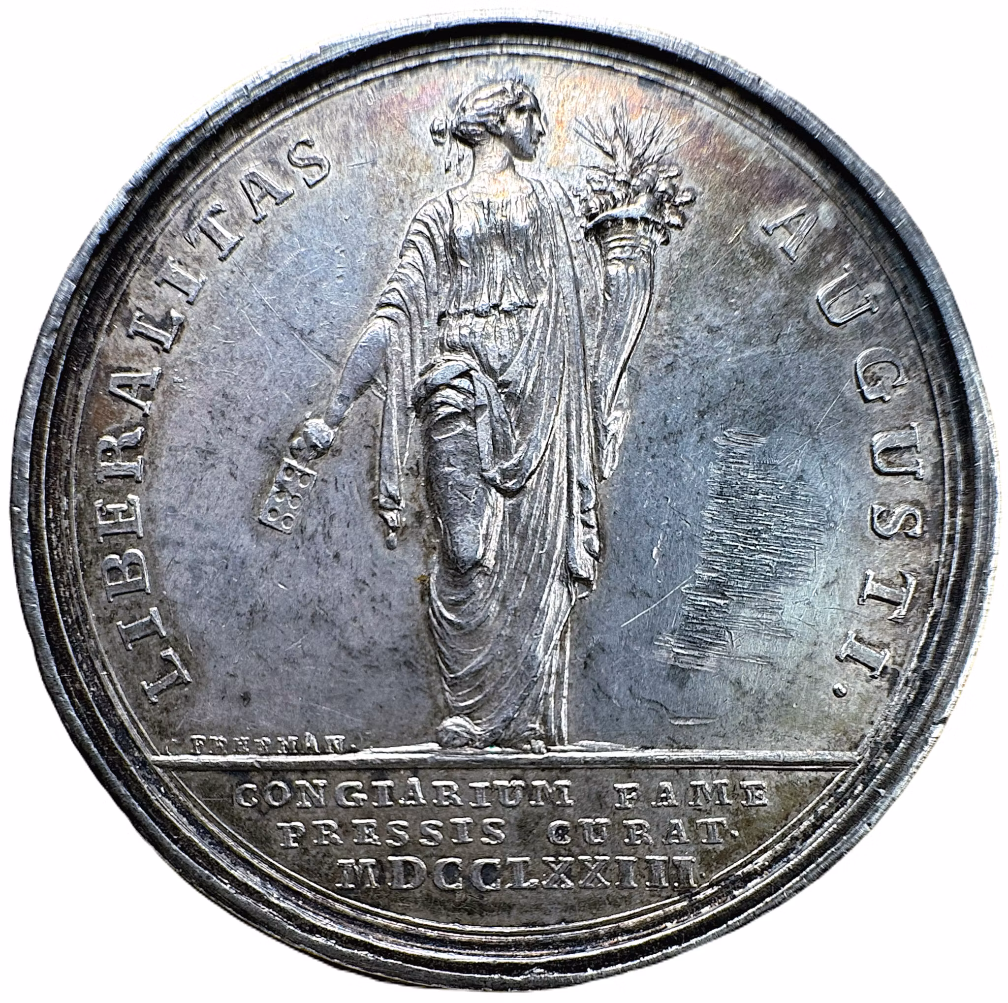En stående kvinna (Frikostigheten) med ett ymnighetshorn i vänstra handen och i den högra en liten fyrkantig tavla. Ovanför avskärningslinjen till vänster, gravörens namn: "C FEHRMAN". I omskriften: "LIBERALITAS AUGUSTI•" och i avskärningen: "CONGIARIUM FAME / PRESSIS CURAT• / MDCCLXXIII•"