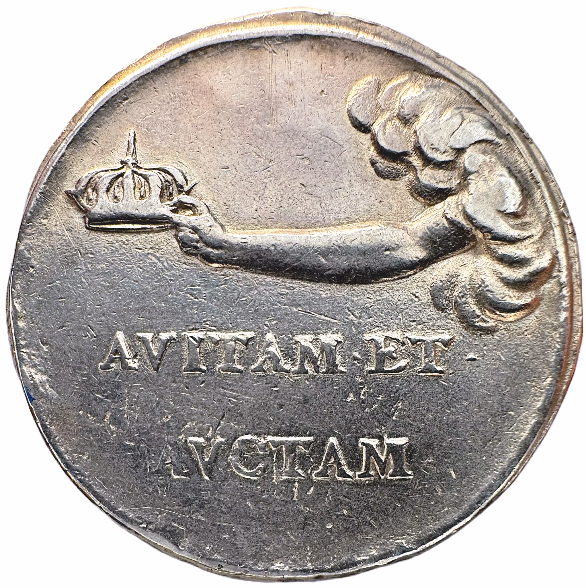 Silver, 42.2g, 42mm, graverad av Erich Parise. SKM 48b (Sveriges kungliga medaljer av Delzanno 2024), Hildebrand 39, mindre märken, kvalitet 1+ . Medan detta minnesobjekt, präglat för ceremonin, fångar den officiella berättelsen i sin bild, avslöjar en närmare blick på dess ytor en djupare historia. Här blir svaga spår av en äldre förgyllning och tecken på varsamt slitage och rengöring till ledtrådar som vittnar om hur medaljen en gång burits som ett praktfullt hedersbevis. Det är just dessa spår av ett levt liv som ger objektet dess unika historiska själ.