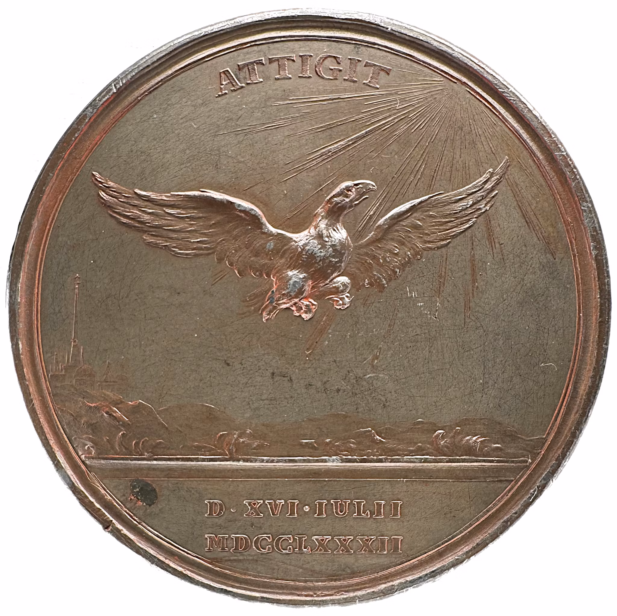En örn uppflygande över ma ken mot den strålande solen. Bak om klippor ses Rid darholms kyrkans torn och andra byggnader. Överst texten: " ATTIGIT. " och i avskärningen: "D. XVI. IULII MDCCLXXXII."