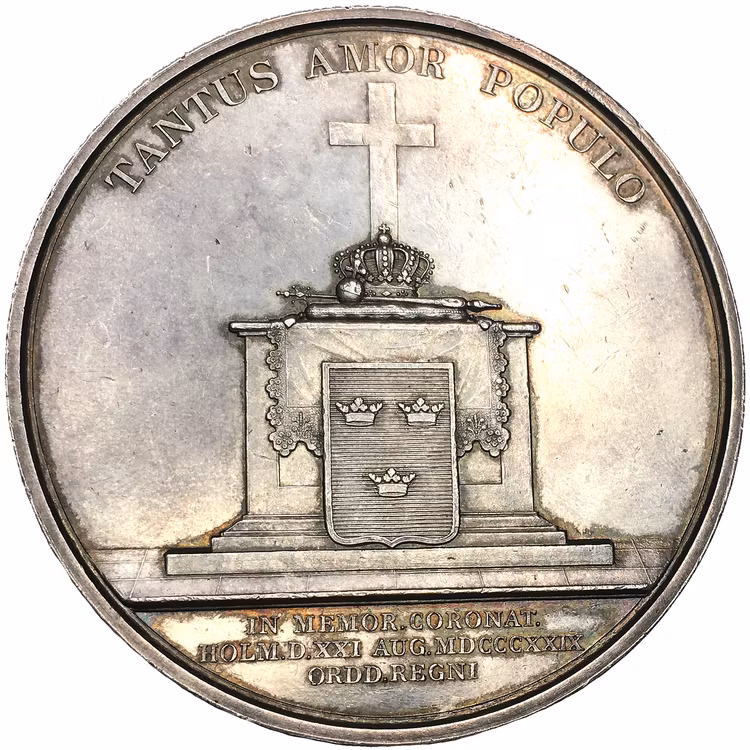 En synnerligen sällsynt medalj. I silver har vi endast noterat det här utbjudna exemplaret i modern tid. Medaljen saknades i storsamlares samlingar som friherre Bonde på Ericsbergs slott, Sune Eberhard Crona och Duke of Northumberland. Vid pressläggningen av SVERIGES MYNTBOK satte jag RR och ett försiktigt värderingspris, dock visar mina vidare efterforskningar att medaljens raritet bör justeras till RRR och därmed ochså värderingspriset. Ett vackert och tilltalande exemplar med endast obetydlig hantering. Silver, 92,2 g. 58 mm. Hildebrand 3, kvalitet 1+/01. Graverad av Ludvig Persson Lundgren.