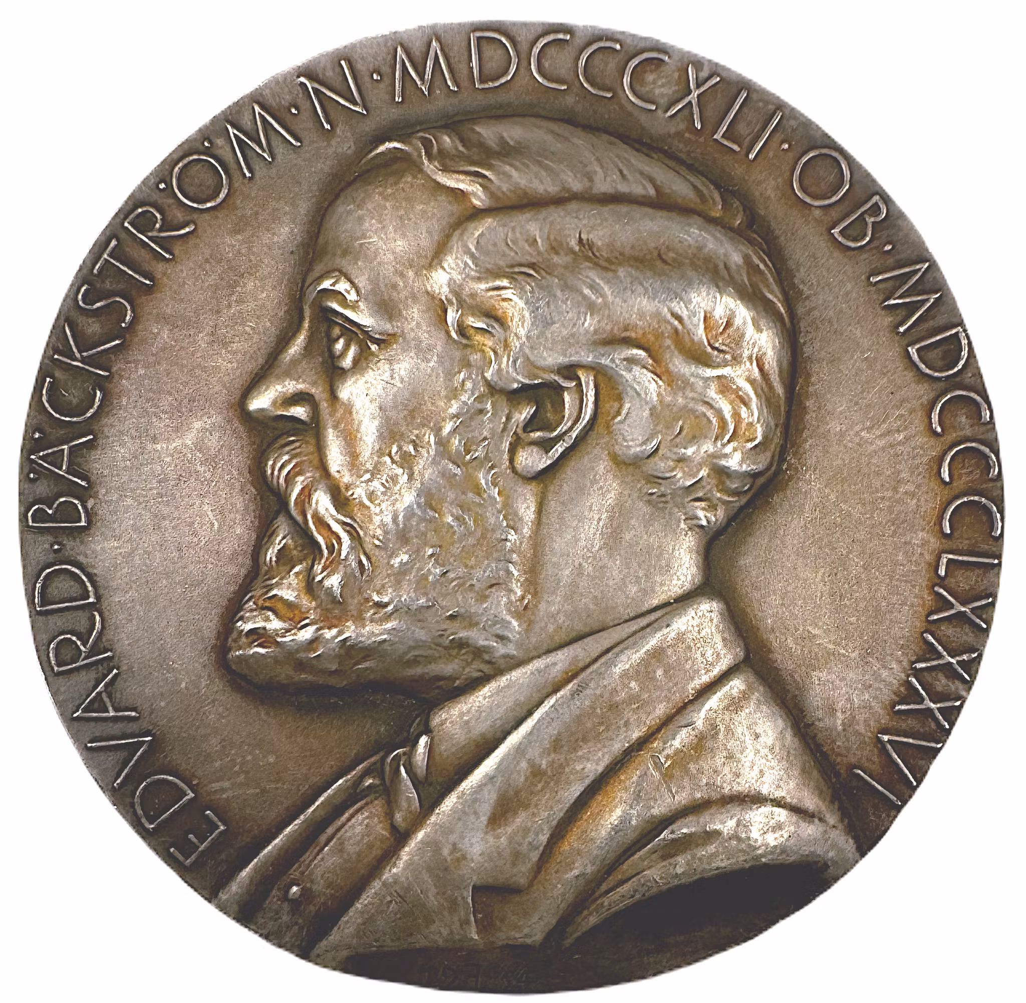 Född 27 oktober 1841 i Stockholm, död 12 februari 1886 i Stockholm, svensk författare, tidningsman, sångtextförfattare och översättare, son till den historiske författaren Per Olof Bäckström. Slagen för Svenska akademien 1954. Av Erik Lindberg. Silver. 45 mm. 45,21 g. Svensén 338. Ehrensvärd 466. Vackert tonad. Kvalitet god 01. Präglad i en upplaga om endast 127 exemplar samt ett extra arkivexemplar till Kungliga myntkabinettets samling. Randprägling: "MJV SILVER 1954".