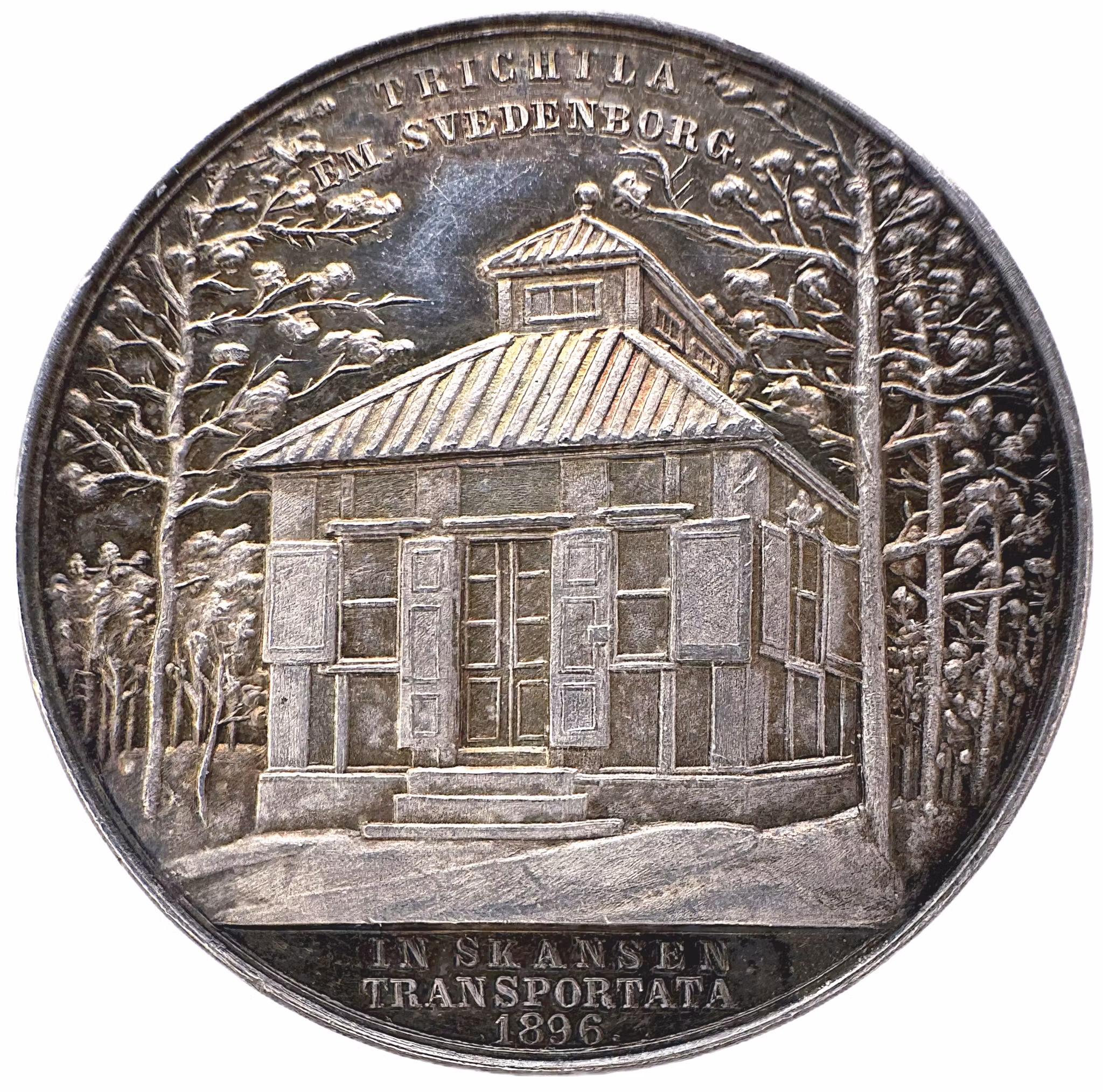 Motivet visar Swedenborgs berömda lusthus placerat i en lummig omgivning av barrträd. Byggnaden är ett kvadratiskt lusthus med sadeltak, krönt av en lanternin. Dörrarna står öppna och fönsterluckorna är uppfällda, vilket ger en inbjudande känsla. Den övre omskriften lyder: "TRICHILA EM. SVEDENBORG." I avskärningen (exergen) står texten fördelad på tre rader: "IN SKANSEN / TRANSPORTATA / 1896".