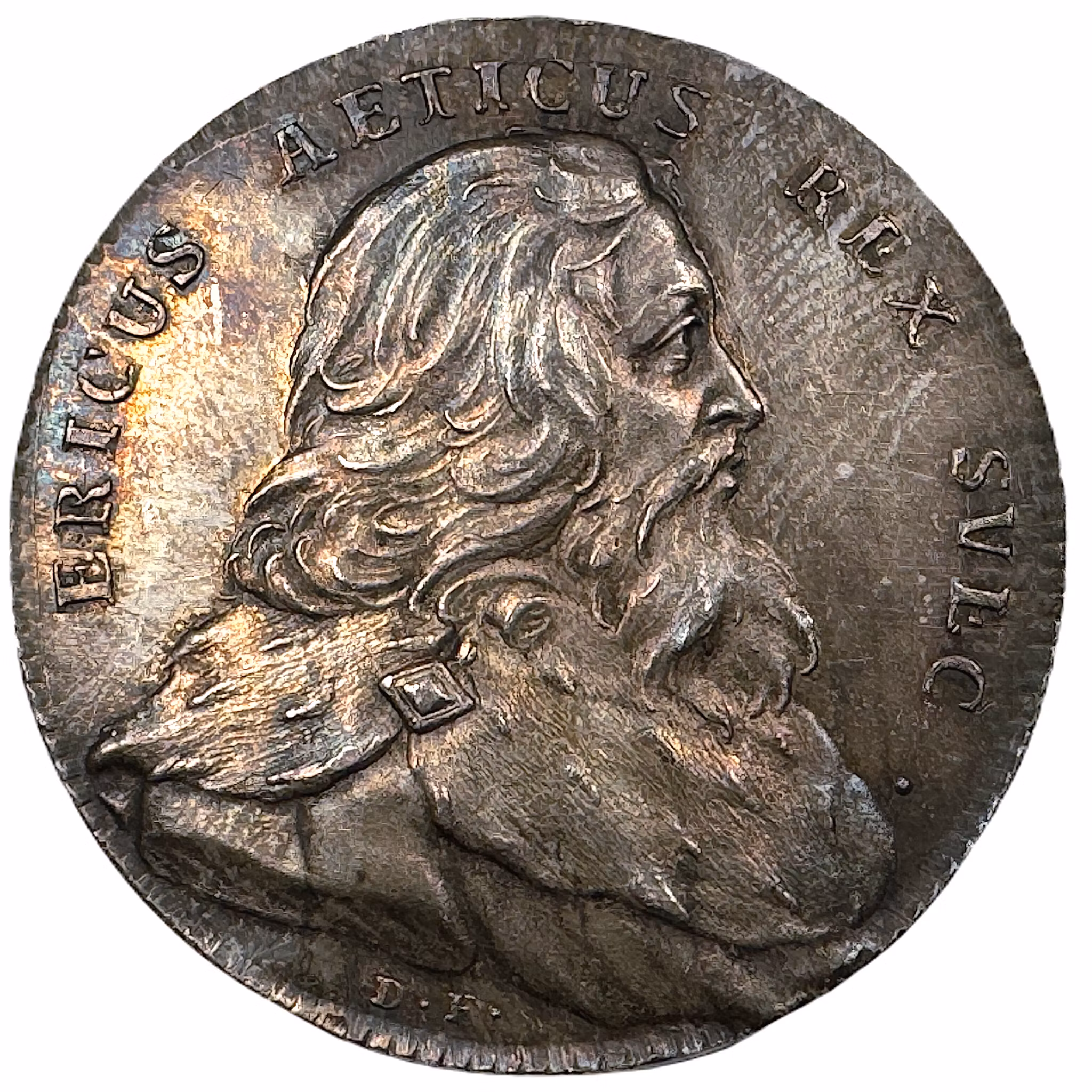 Erik Knutssons högervända bröstbild iklädd hermelinsmantel. Nedanför: "D•F•". I omskriften: "ERICUS AETICUS REX SVEC•"