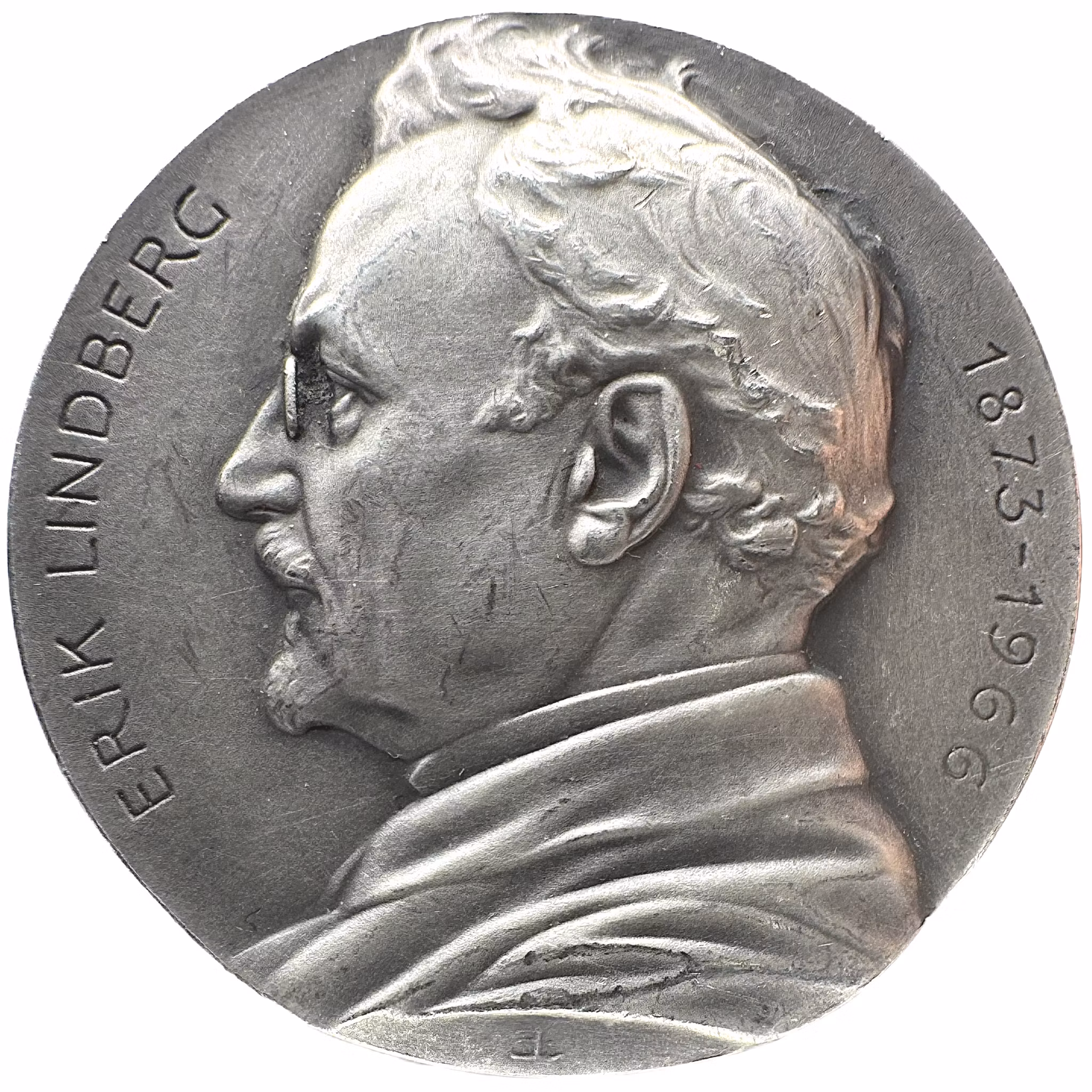 Kvalitet 01, Silver, 18,37 g, 31 mm. Självporträtt av Erik Lindberg bearbetat av Léo Holmgren. På randen silverstämplar: 925 (finhalt), MV (Myntverket) och B10 (årtalsstämpel för 1976). Medaljen är präglad med bidrag från Burmesters medaljfond, inrättad 1919. SNF 56
