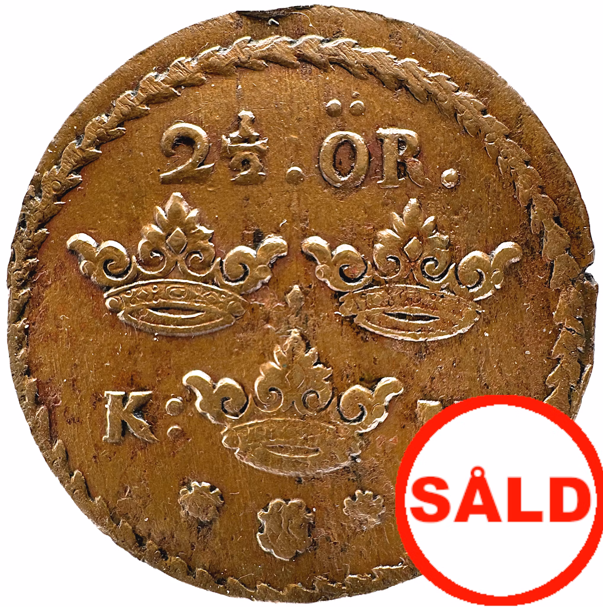 Detta exceptionella 2 ½ öre KM 1661 är det bästa kända exemplaret på marknaden. Myntet har tidigare tillhört den välkände och kvalitetskräsne storsamlaren Per-Göran Carlssons samling. Carlsson, en av Sveriges främsta kännare av typen, bekräftar personligen att detta är det finaste exemplar han någonsin sett. Han nämner två andra mynt av nästan jämförbar kvalitet, men understryker att detta exemplar sticker ut med sitt oslagbara helhetsintryck. Myntet bedöms som kvalitet 01 med perfekta ytor och sylvassa kanter, helt fria från de metallfel som annars är så vanliga för denna mynttyp. 43.81g, 47mm, SMB 521