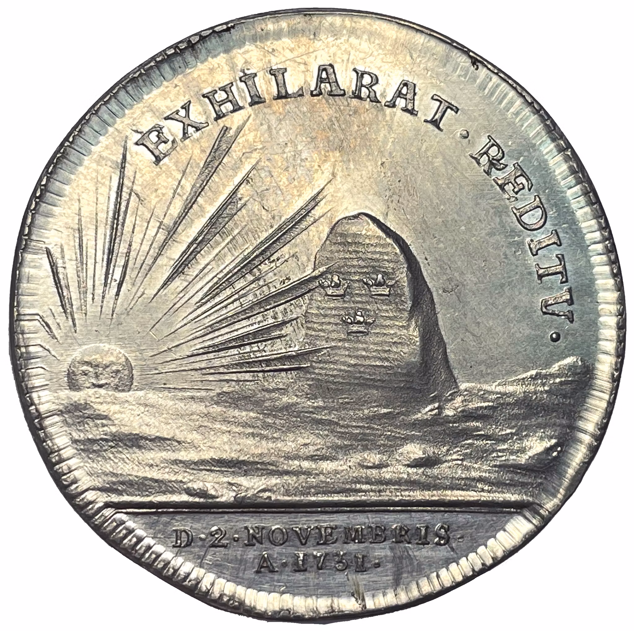 Den uppgående solen kastar strålar över en rest gränssten tecknad med Sveriges tre kronor. I avskärningen: "D. 2. NOVEMBRIS. A. 1731" och i omskriften: "EXHILARAT. REDITV". Översatt lyder texten: "Den skänker glädje genom sin återkomst, den 2 november år 1731".