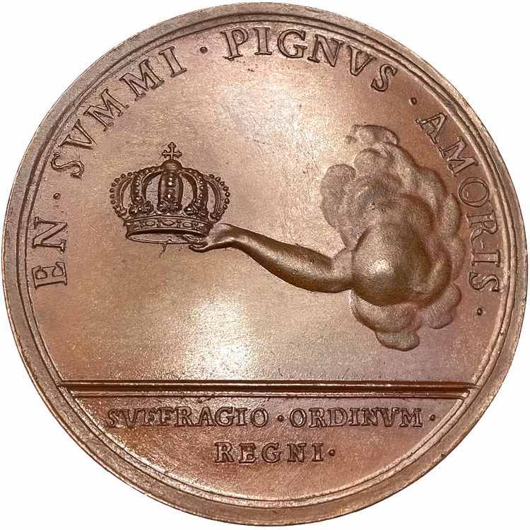 En kvinnlig arm utstickande från ett moln sträcker fram en krona, ovanför texten: "EN SVMMI PIGNVS AMORIS" och i avskärningen nederst: "SVFFRAGIO ORDINVM REGNI", som översatt betyder: "Se, här är den största kärleks pant - Enligt rikets ständers val".