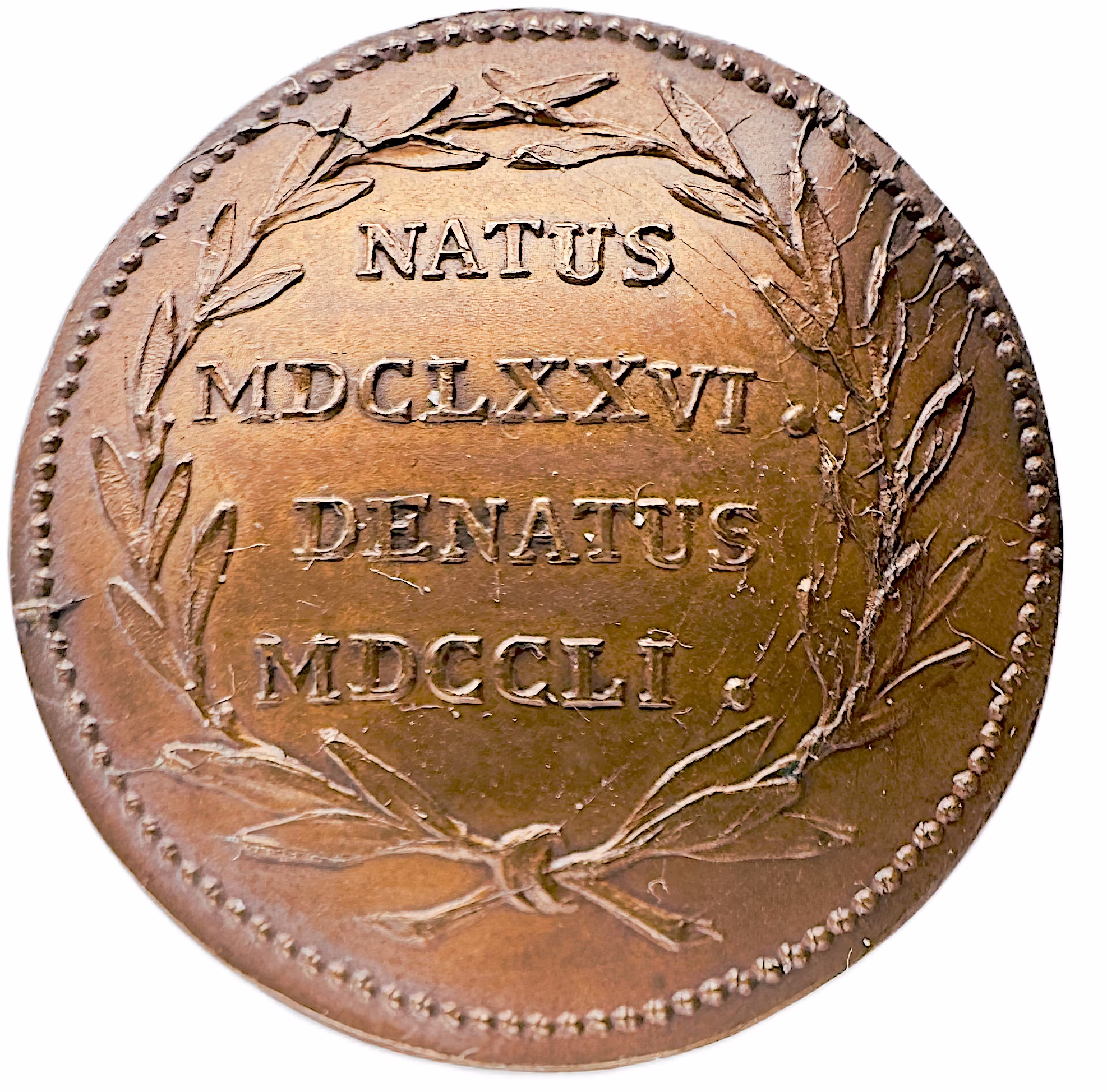 Frånsidan pryds av en stilren, fyraradig inskription placerad centralt och inramad av en bunden, öppen lagerkrans. Texten lyder: "NATUS / MDCLXXVI· / DENATUS / MDCCLI·". Det latinska originalet utläses Natus 1676. Denatus 1751. På svenska översätts detta till: Född 1676, avliden 1751.