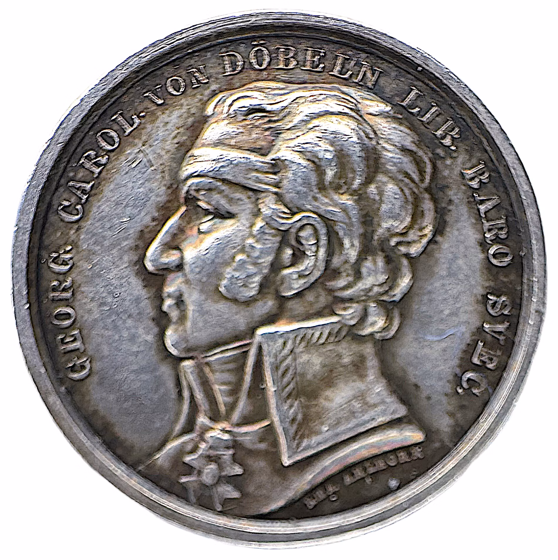 Det finns få profiler i den svenska historien som är så omedelbart igenkännliga som den på denna silvermedalj. Det är inte uniformen eller ordensstjärnan som drar blicken till sig, utan det breda bandet över pannan. Georg Carl von Döbeln var mannen som bokstavligen bar kriget inristat i sin kropp. När Svenska Akademien 1883 lät Lea Ahlborn gravera denna minnespenning, hedrade de en gestalt som genom Runebergs diktning blivit myt, men som i verkligheten var en komplex, bitter och briljant officer som såg sitt livsverk krossas men sin heder bestå.