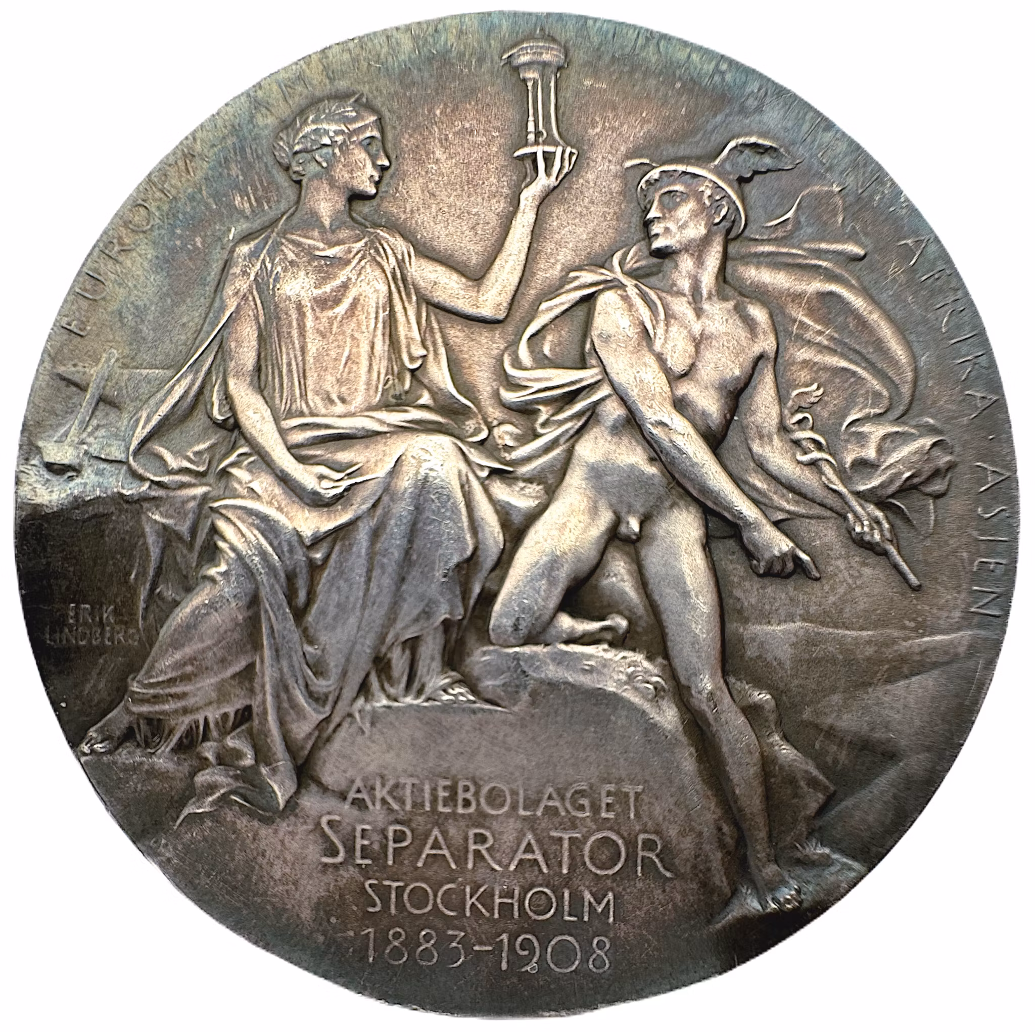 Merkurius står med ena knäet mot en klippa där geniusen för uppfinningar sitter med en passare i högra handen och en separator i vänstra; bakom henne syns olika symboler för industrin. På klippan finns inskriften: "AKTIEBOLAGET SEPARATOR | STOCKHOLM | 1883-1908". Omskriften lyder: "EUROPA AMERIKA - AUSTRALIEN AFRIKA ASIEN."